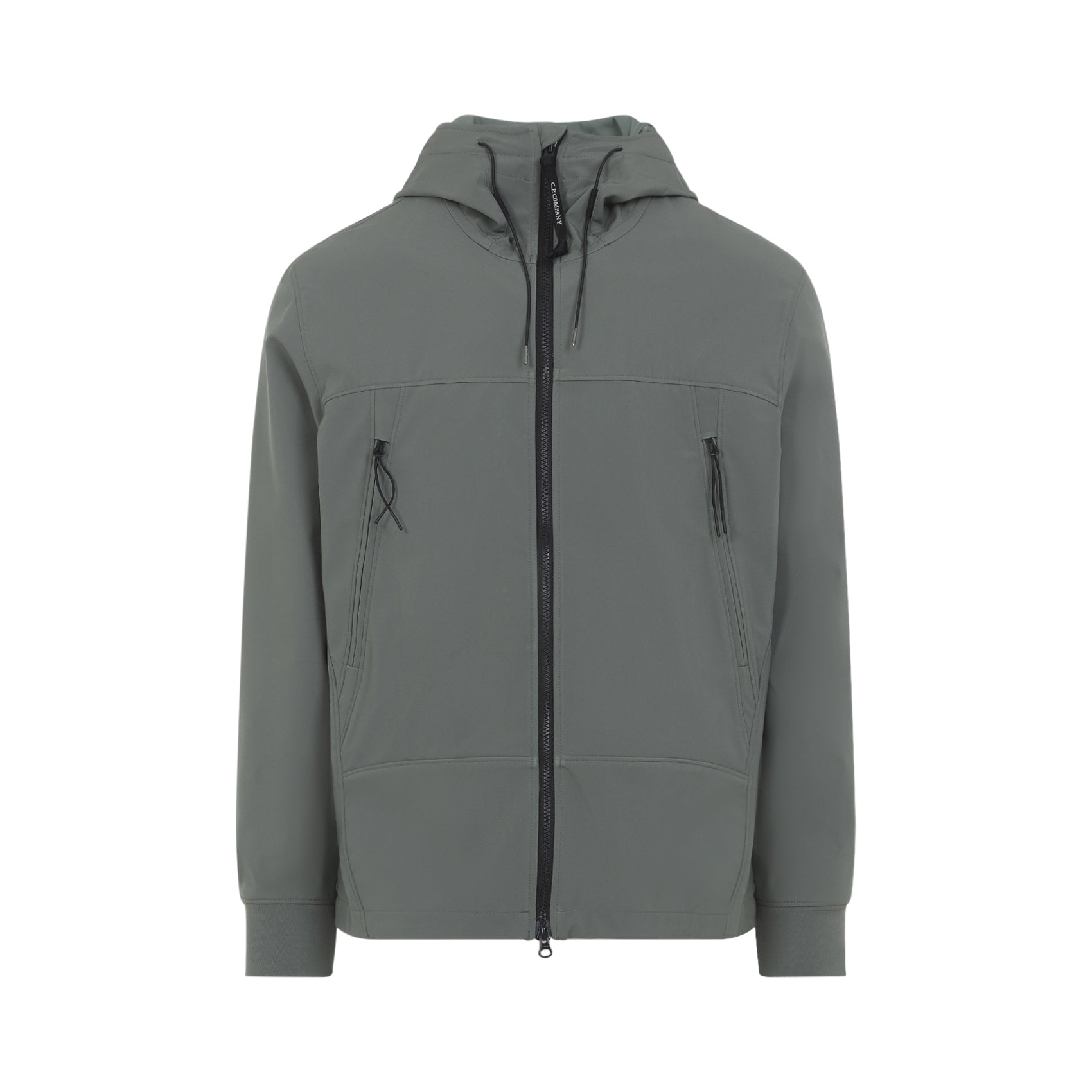 Cp Company Shell-R Goggle Green Polyester Jacket. Crafted from green softshell stretch, it features a hood with the iconic Goggle Lens and drawstring, a front two-way zip fastening with branded textile puller, two zip pockets on the front, long sleeves with ribbed cuffs, and a concealed drawstring at the hem. The jacket is windproof and water-repellent.