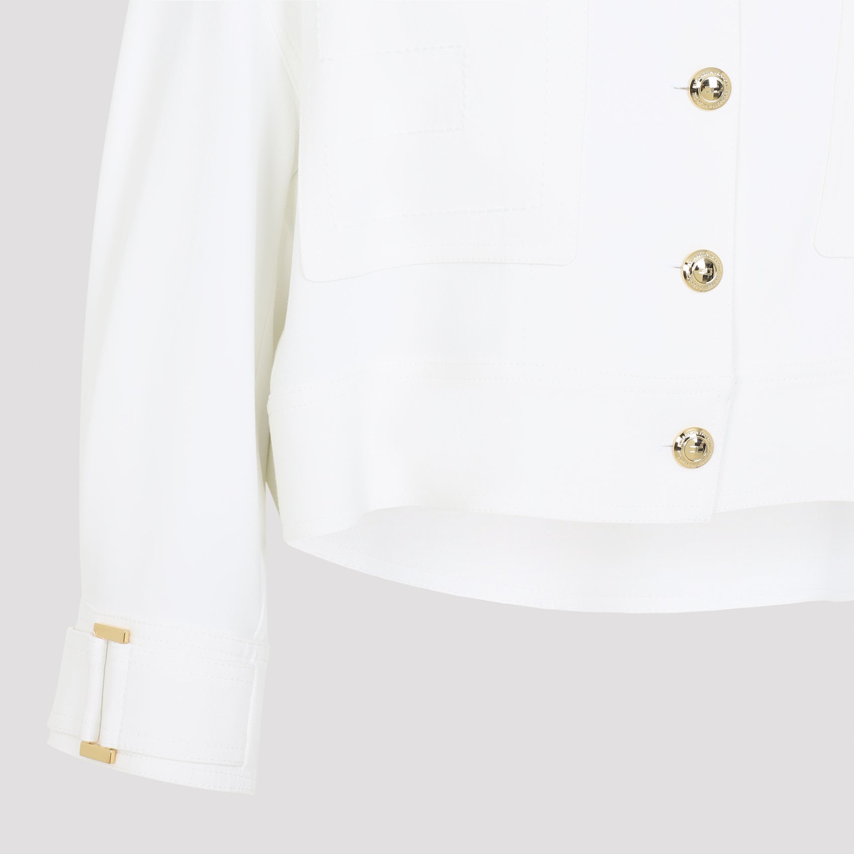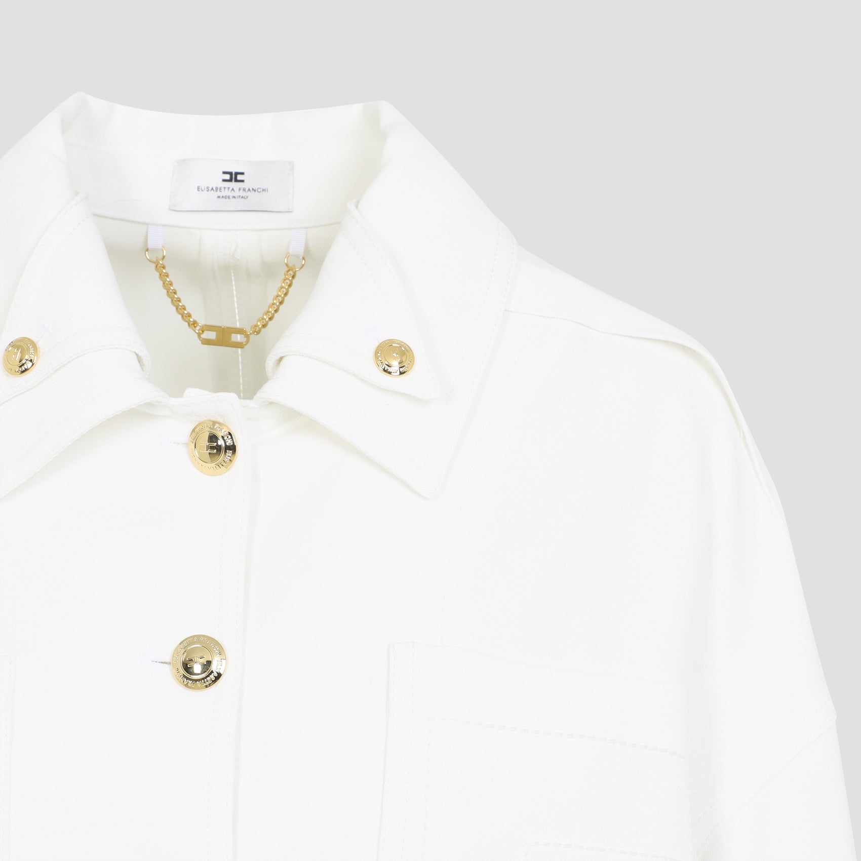 Elisabetta Franchi Ivory White Boxy Jacket. Crafted in viscose and elastane blend. Pointed double collar with gold-tone buttoned detail, front buttoned fastening, chest pocket, long sleeves, buttoned cuffs, asymmetric hem. Gold-tone hardware.