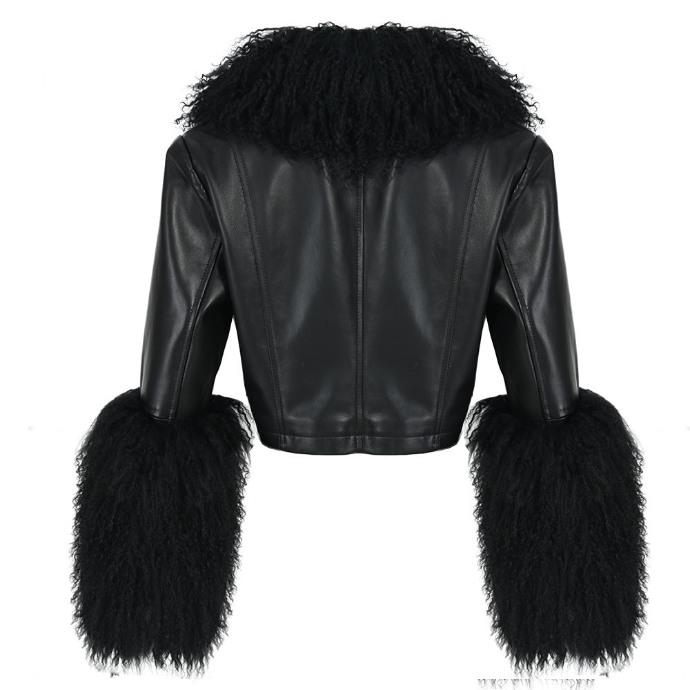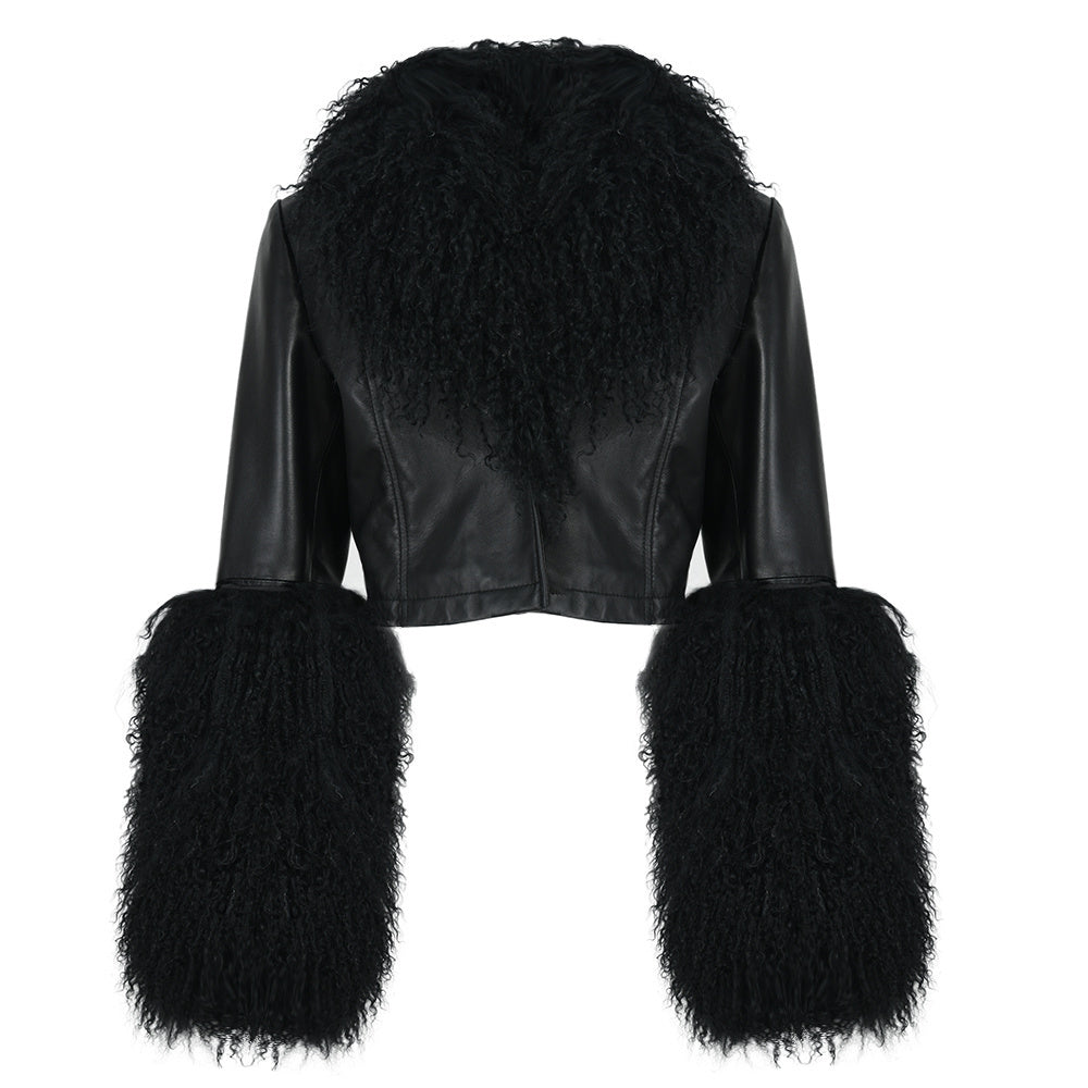 Wanan Touch Giacca Giulienne in pelle di agnello con inserti in lana di Mohair con pregiata lavorazione effetto pelliccia. Chiusura con bottone.