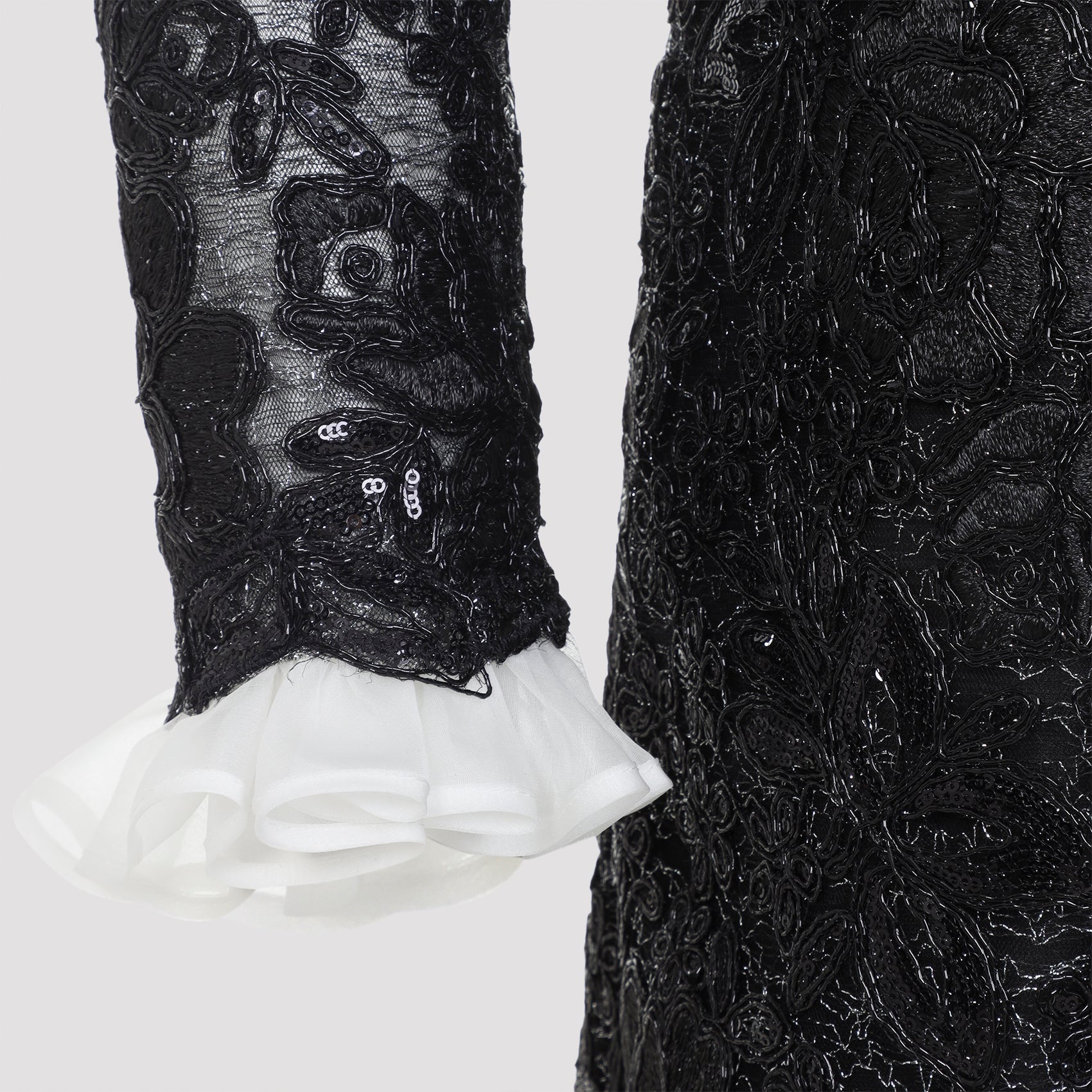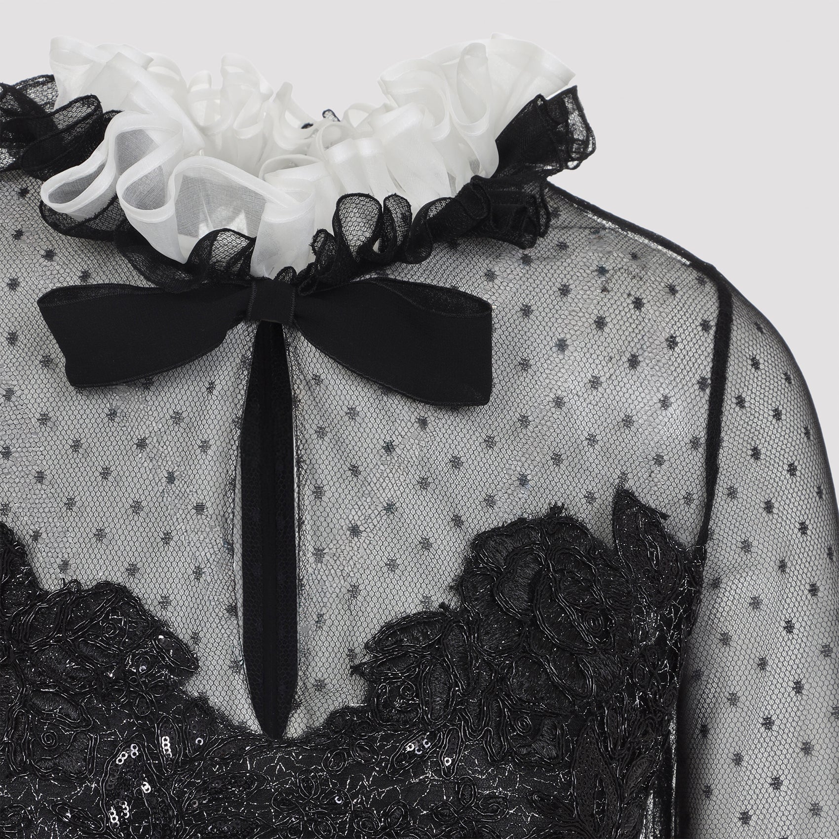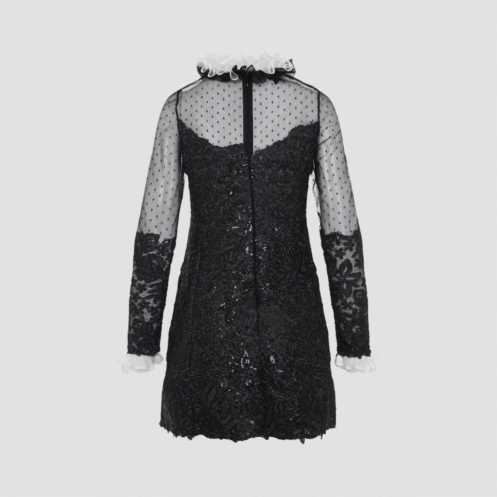 Giambattista Valli Black Mini Dress. Crafted in polyester, polyamide and silk. Ruffled black and white collar, front tonal bow detail, sweetheart lace corset design, back zipped fastening, long sleeves, lace design on the cuffs, contrasting white ruffled cuffs, mini-length, straight hem. Transparent details with tonal polka dot pattern.