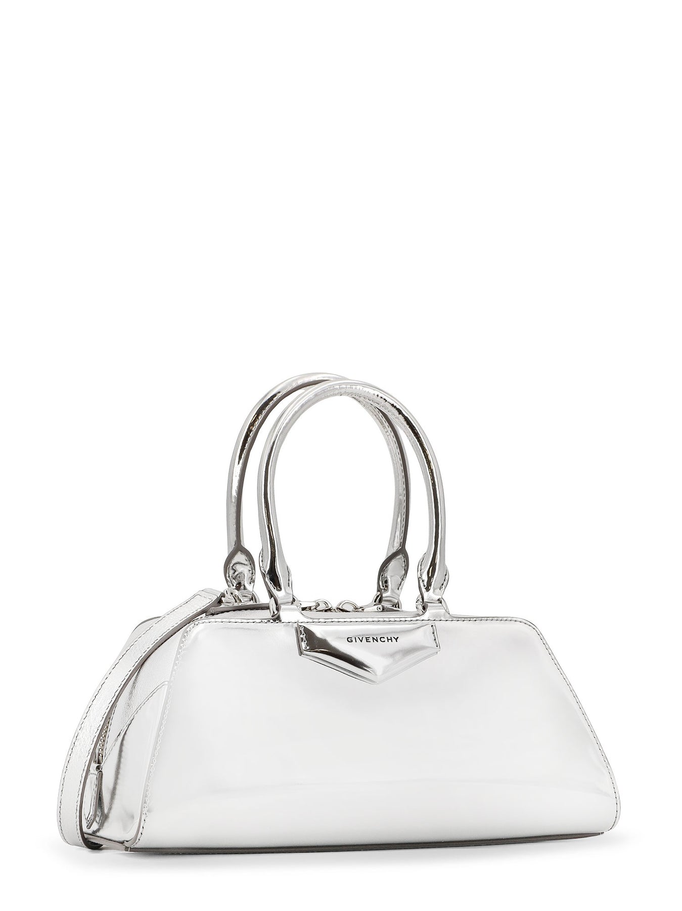 Zip closure with double slider Removable leather shoulder strap Double leather handle Givenchy signature on the front Internal leather pocket Made in Italy Metallic leather W: 28cm x H: 23cm x D: 16cm SKU: BB5130B29U934