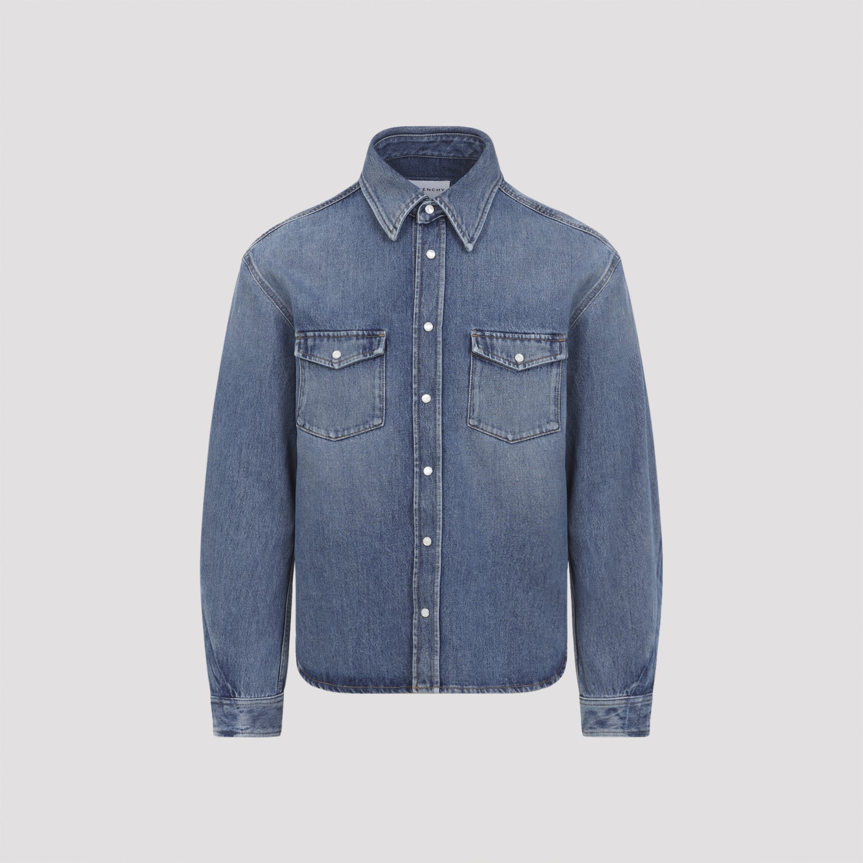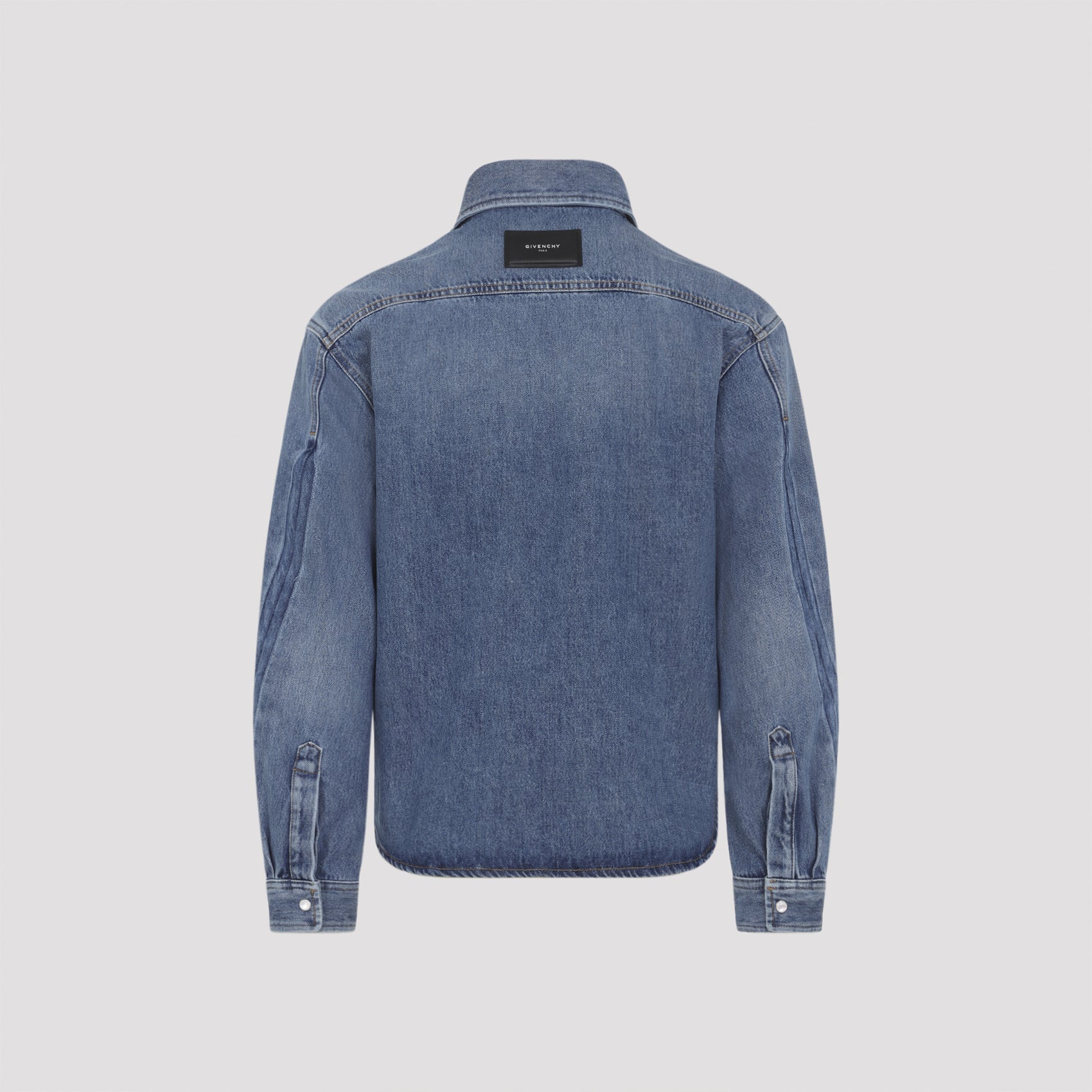 Givenchy Blue Classic Shirt. Crafted from bleached blue cotton denim, featuring a pointed collar, mother-of-pearl buttons, front button fastening, two flap pockets placed on the chest, long sleeves with buttoned cuffs, a back yoke with a branded leather label detail, and a rounded hem.