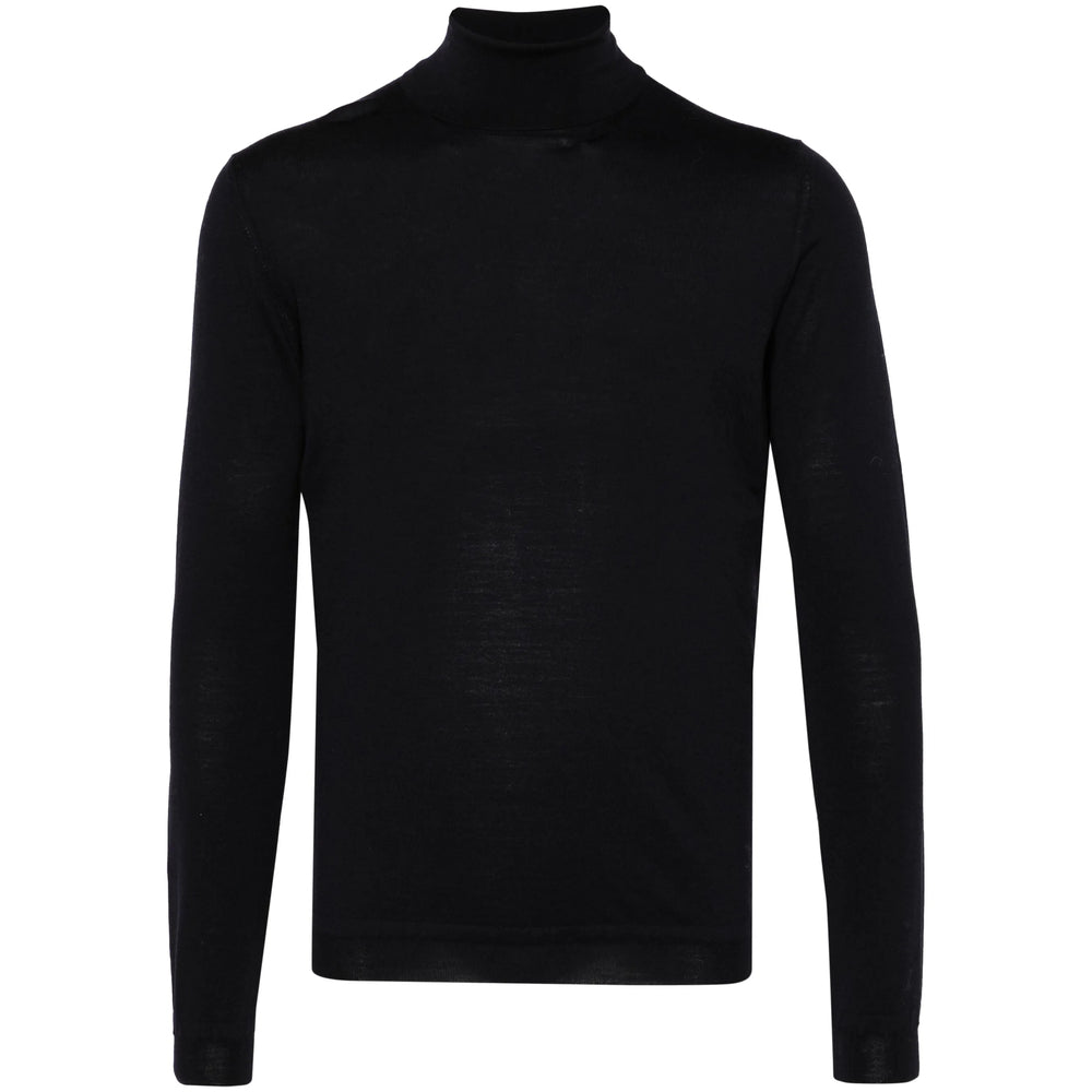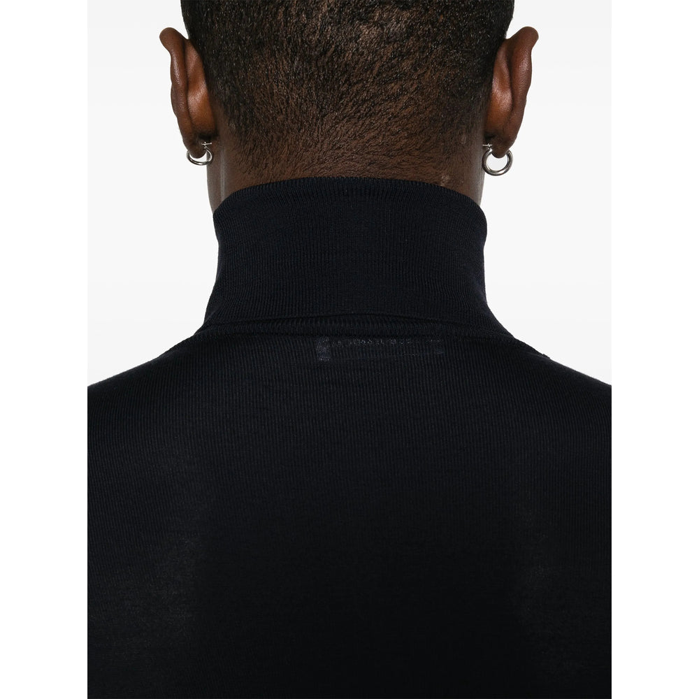 midnight blue merino wool fine knit ribbed turtleneck long sleeves ribbed cuffs and hem