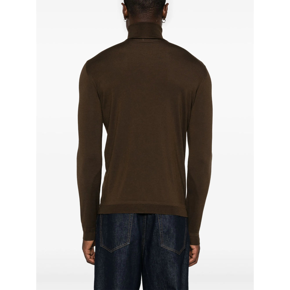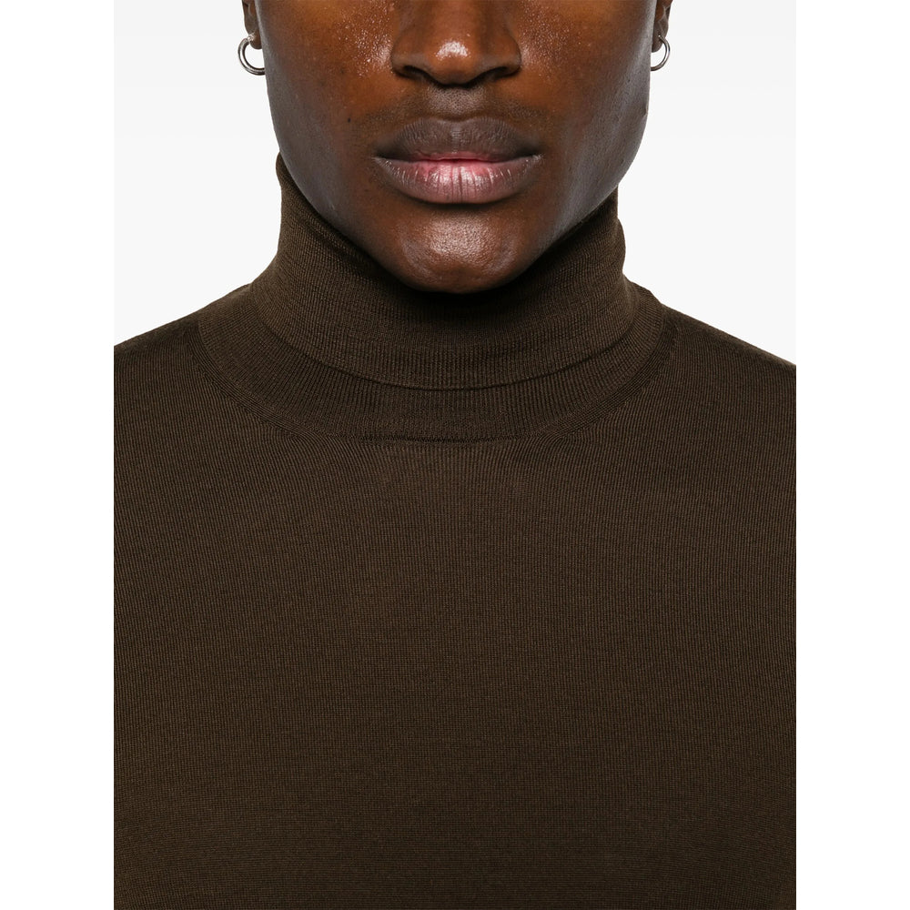 chocolate brown merino wool fine knit ribbed turtleneck long sleeves ribbed cuffs and hem