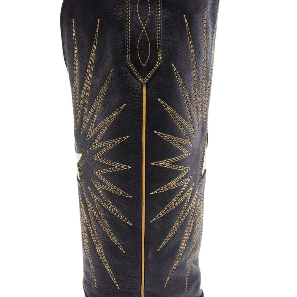 black leather textured finish embroidered design Cuban heel pointed toe slip-on style