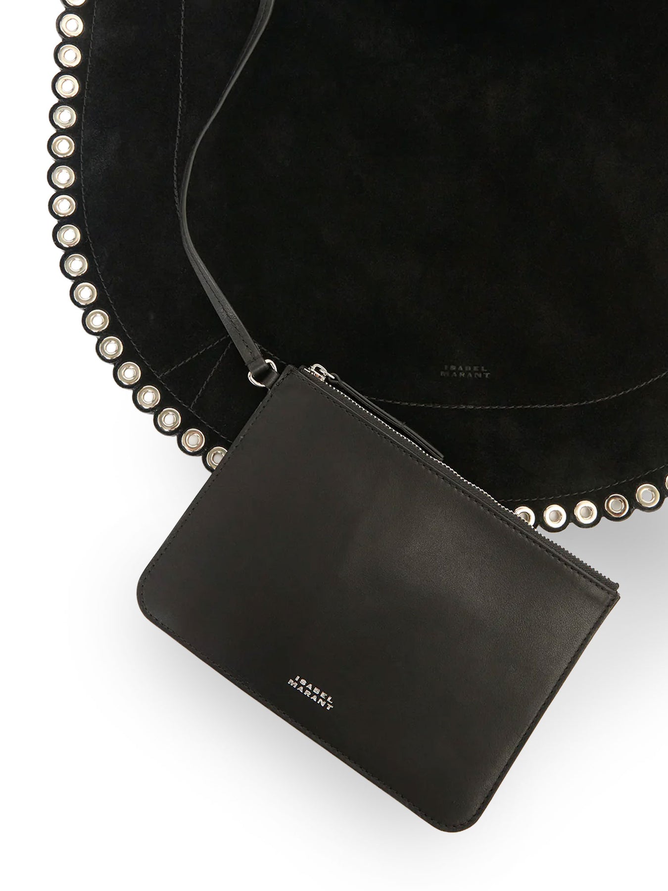 Magnetic button closure Leather handle with stitching Metal stud trim Internal pouch Suede W: 43cm x H: 38cm SKU: PP0200FDD1C10MBKSI