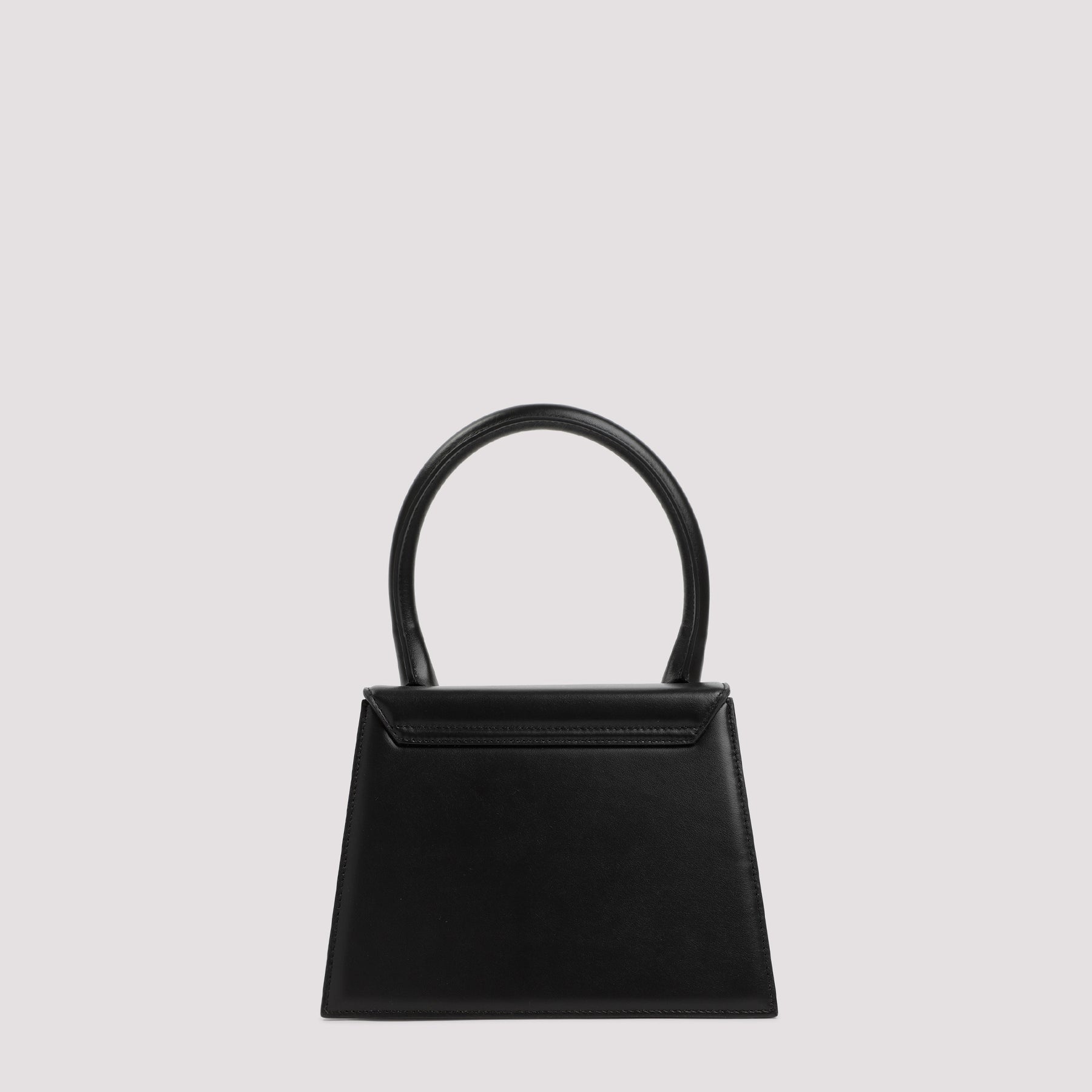 Jacquemus Le Grand Chiquito Handle Bag. Black leather, tonal detachable and adjustable shoulder strap with post-stud fastening. Front logo, foldover flap with magnetic press-stud fastening. Fully lined, golden-tone hardware.