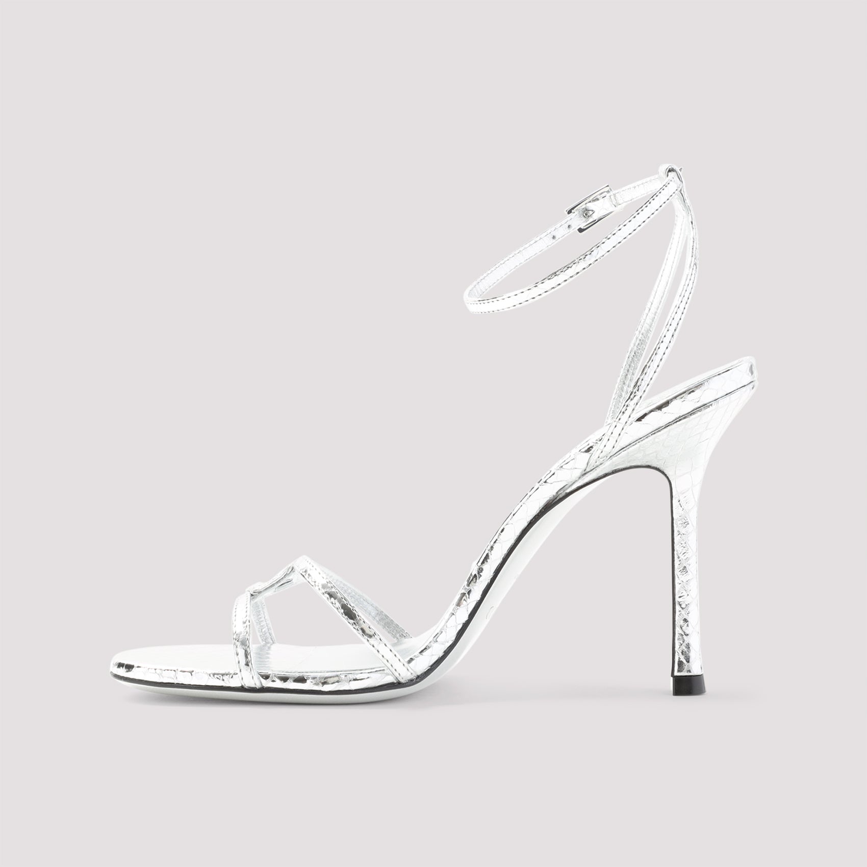 Jimmy Choo Silver Leather 1998 Leo Candy Wrap Sandals. Pure silver leather sandals, round opened toe, top tonal leather straps, adjustable ankle strap, thin tonal heels, leather sole.