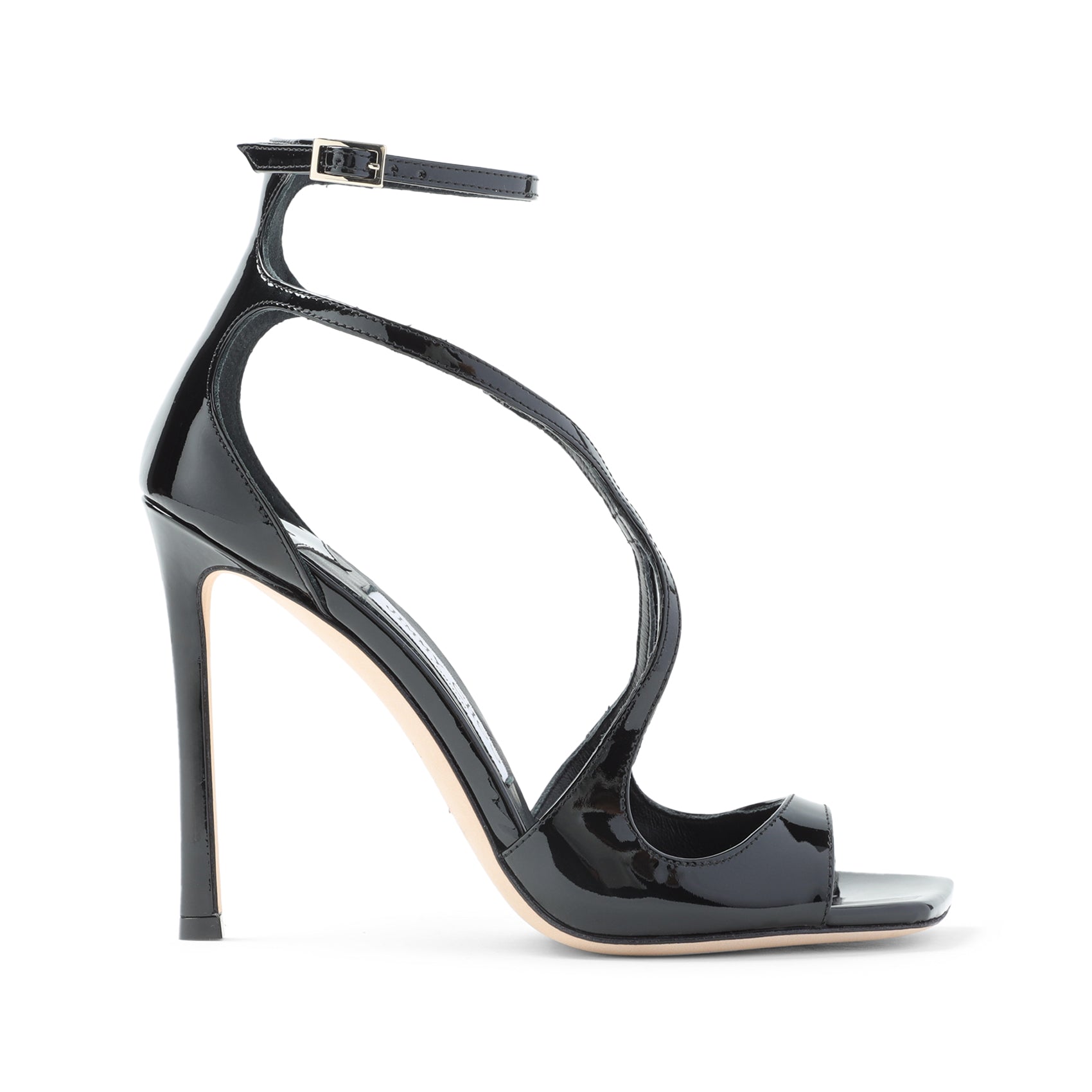 Jimmy Choo Black Patent Leather Azia 110 Sandals. Pure black patent leather sandals, squared opened toe, top strap, top cross strap, adjustable ankle strap, tonal heel, leather sole.