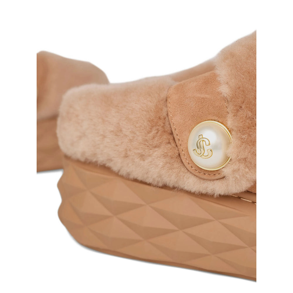 toffee brown fur trim button detail rubber sole geometric pattern platform sole