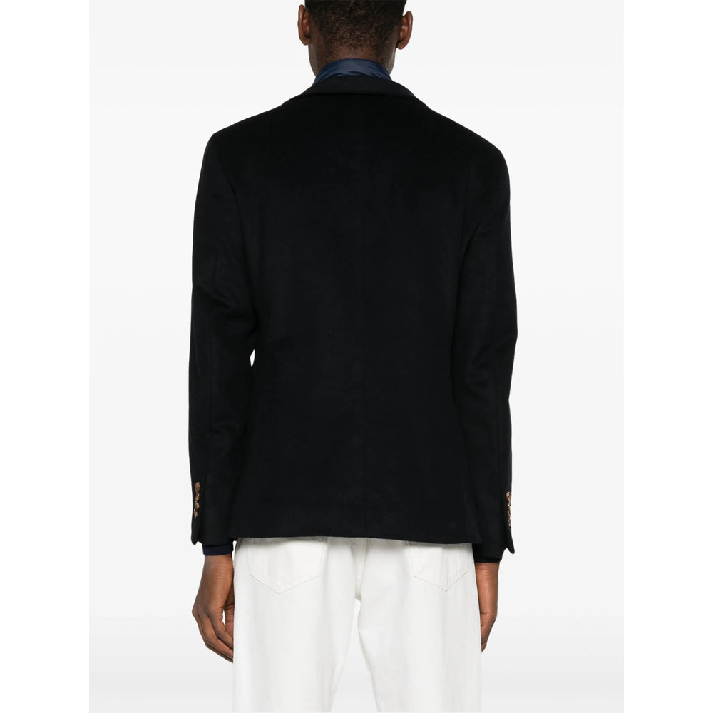 navy blue wool blend front button fastening layered effect classic collar chest welt pocket two side flap pockets zip-fastening pocket buttoned cuffs