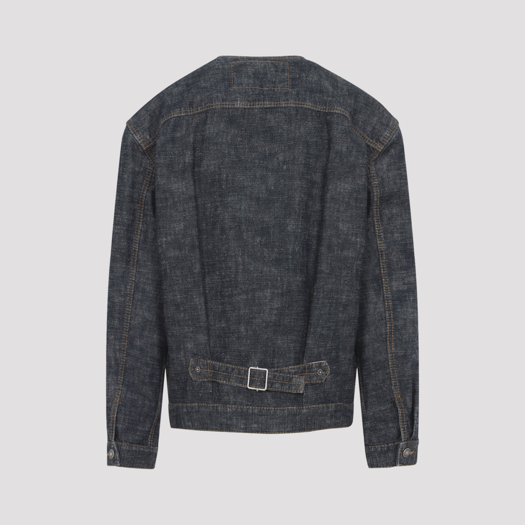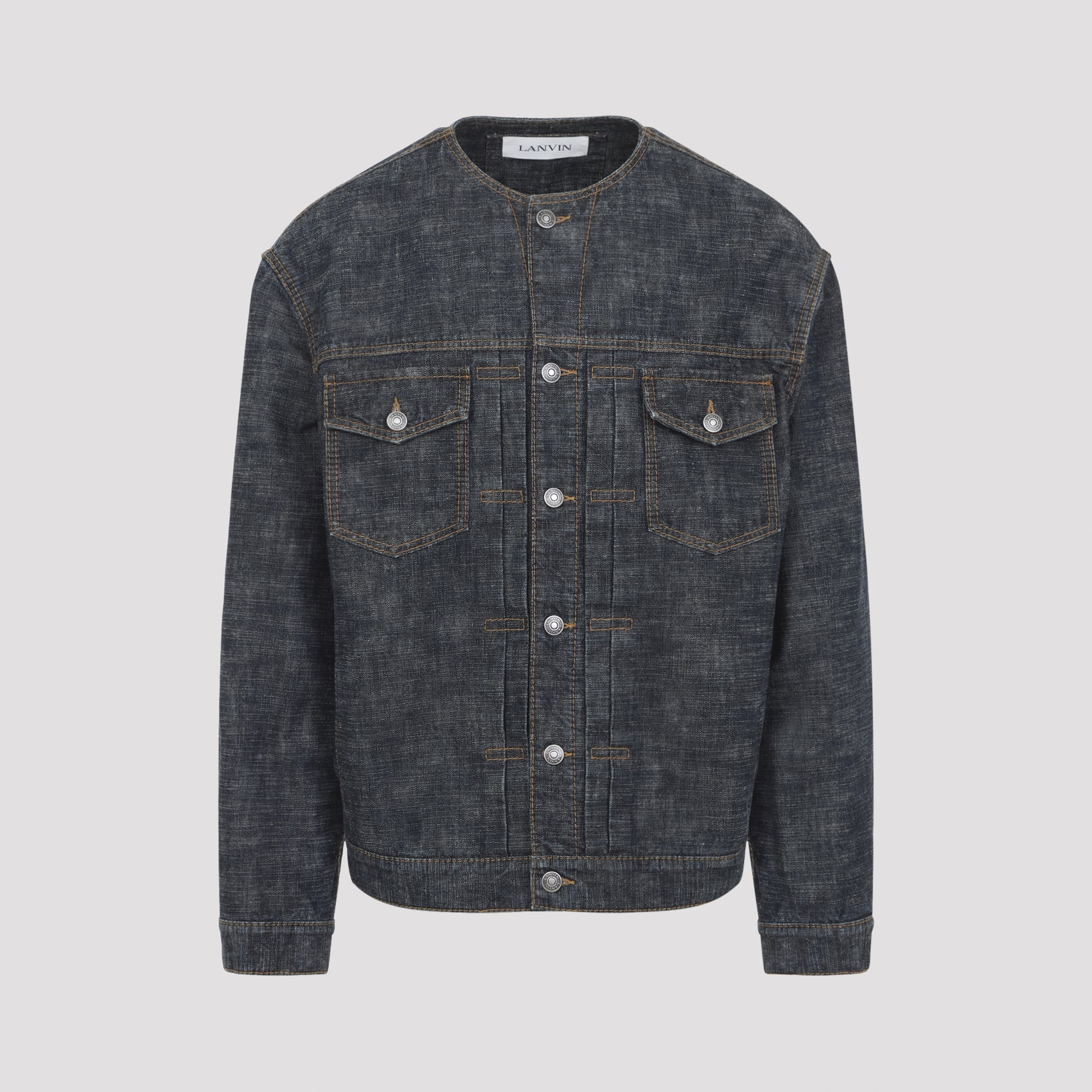 Lanvin Collarless Navy Blue Cotton Jacket. Crafted from bleached navy blue cotton denim, this collarless jacket features a front button fastening, two flap pockets on the chest, long sleeves with buttoned cuffs, and an adjustable strap with a buckle on the back, and comes in a relaxed fit.