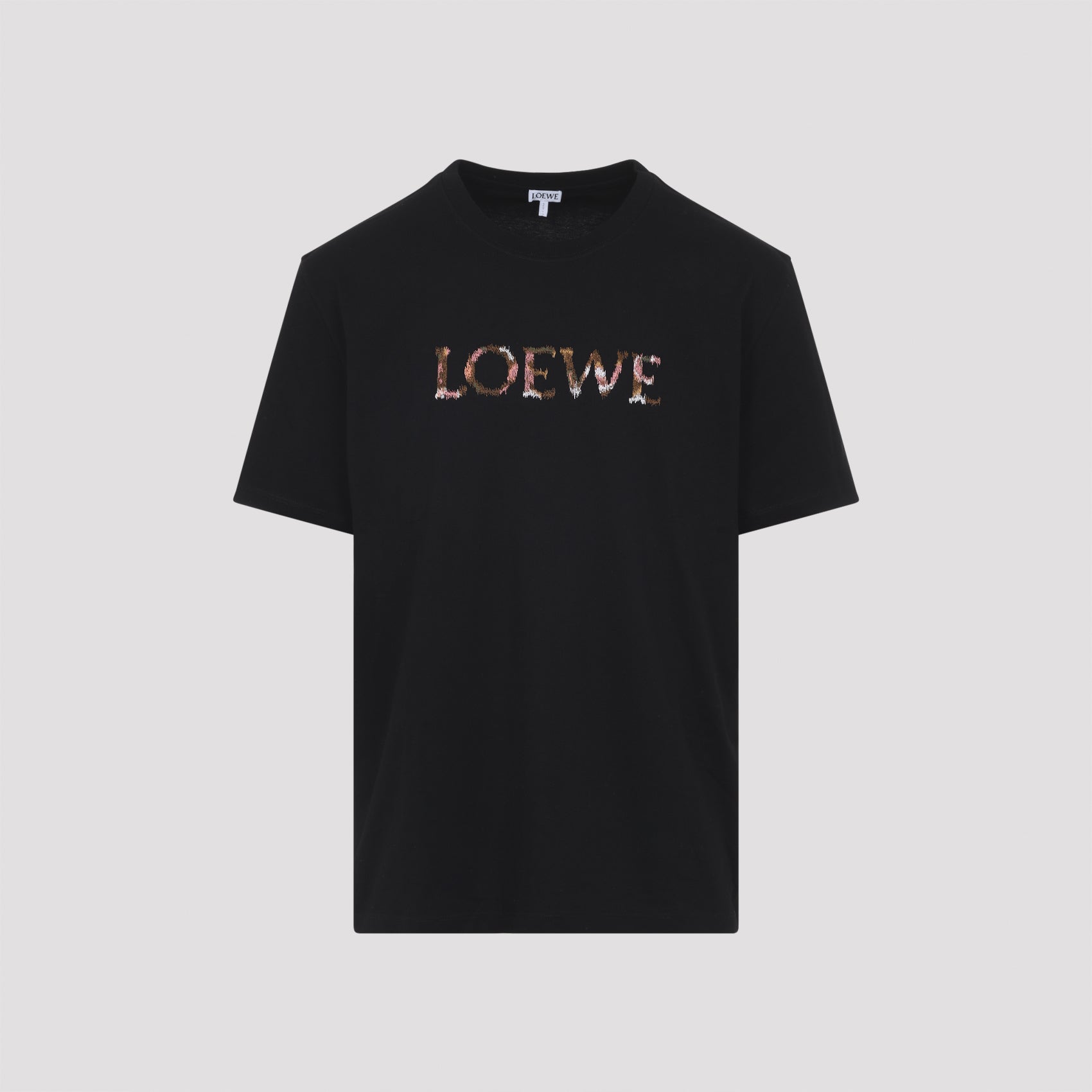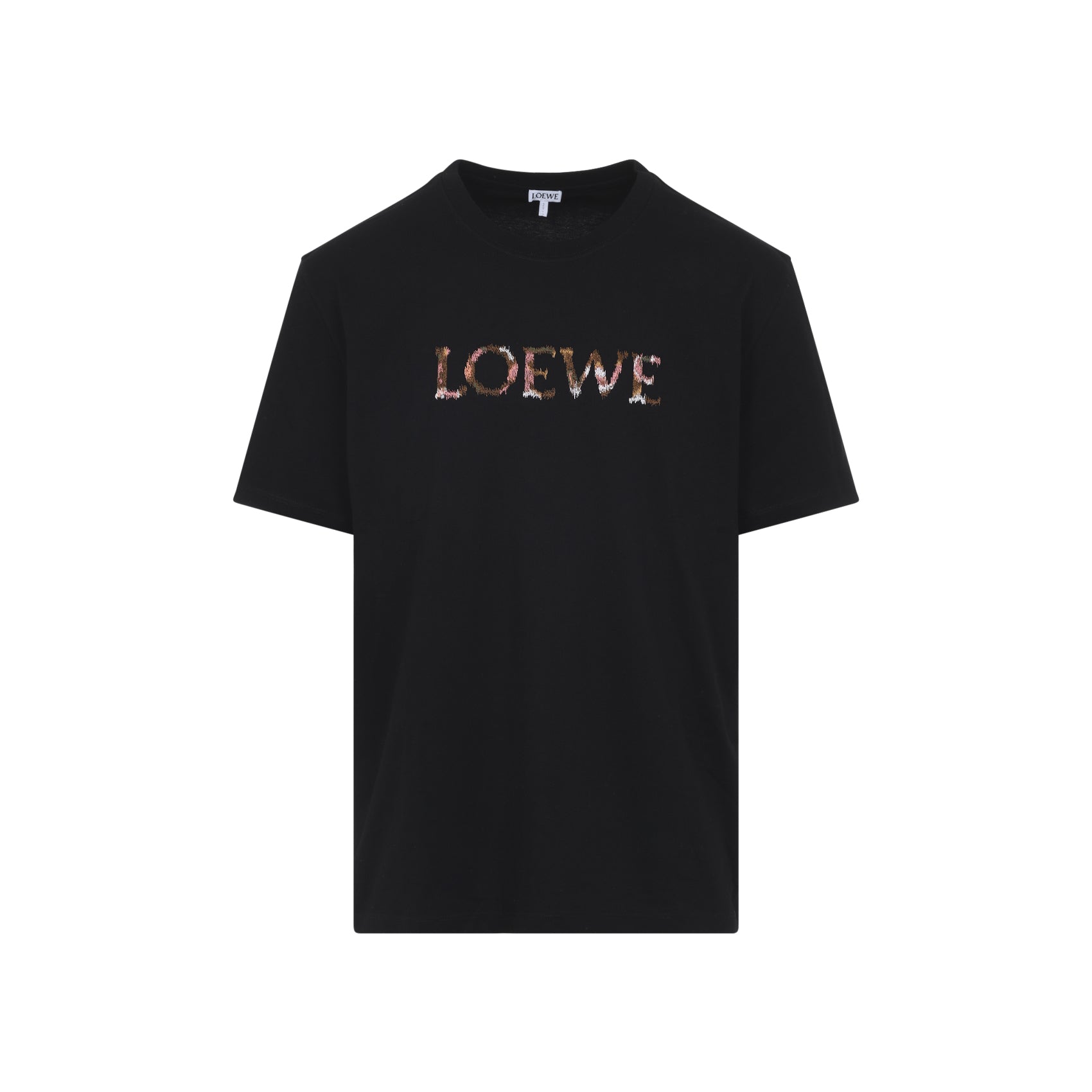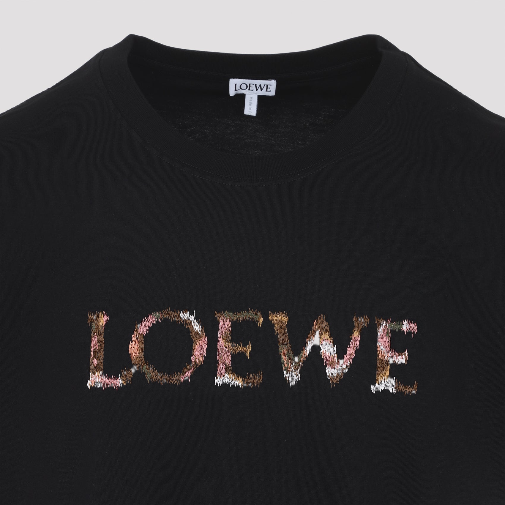 Loewe Relaxed Fit Black Cotton T-shirt. Classic relaxed-fit T-shirt crafted from black cotton blend, featuring a ribbed crew neckline, a multicolour logo embroidery on the chest, short sleeves, and a straight hem.