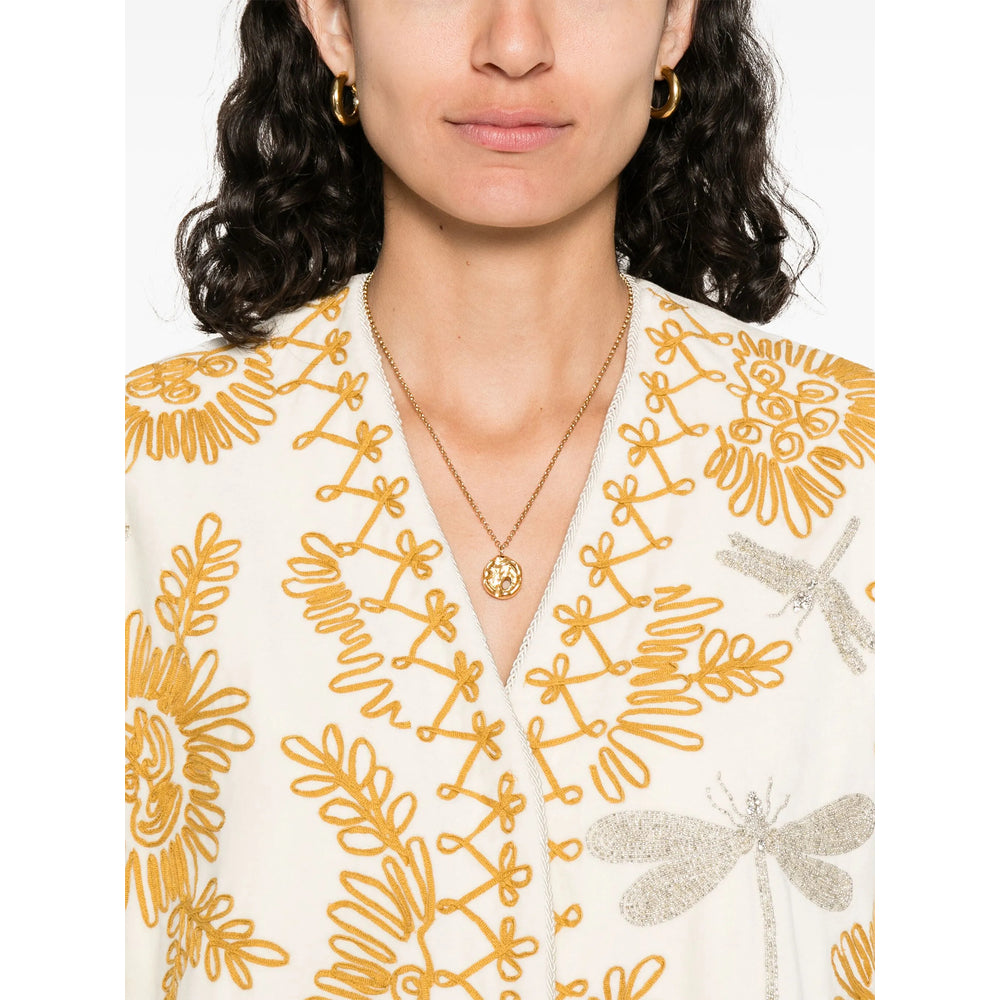 light beige concealed front fastening embroidered design V-neck long sleeves
