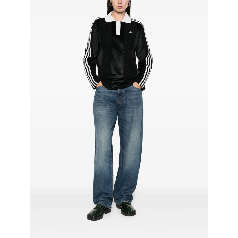 black striped design three stripes at the shoulders front button fastening logo detail