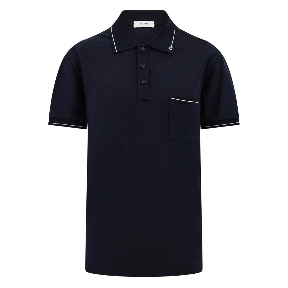 navy blue cotton piqué chest pocket ribbed trims side slits gancio detail on the collar