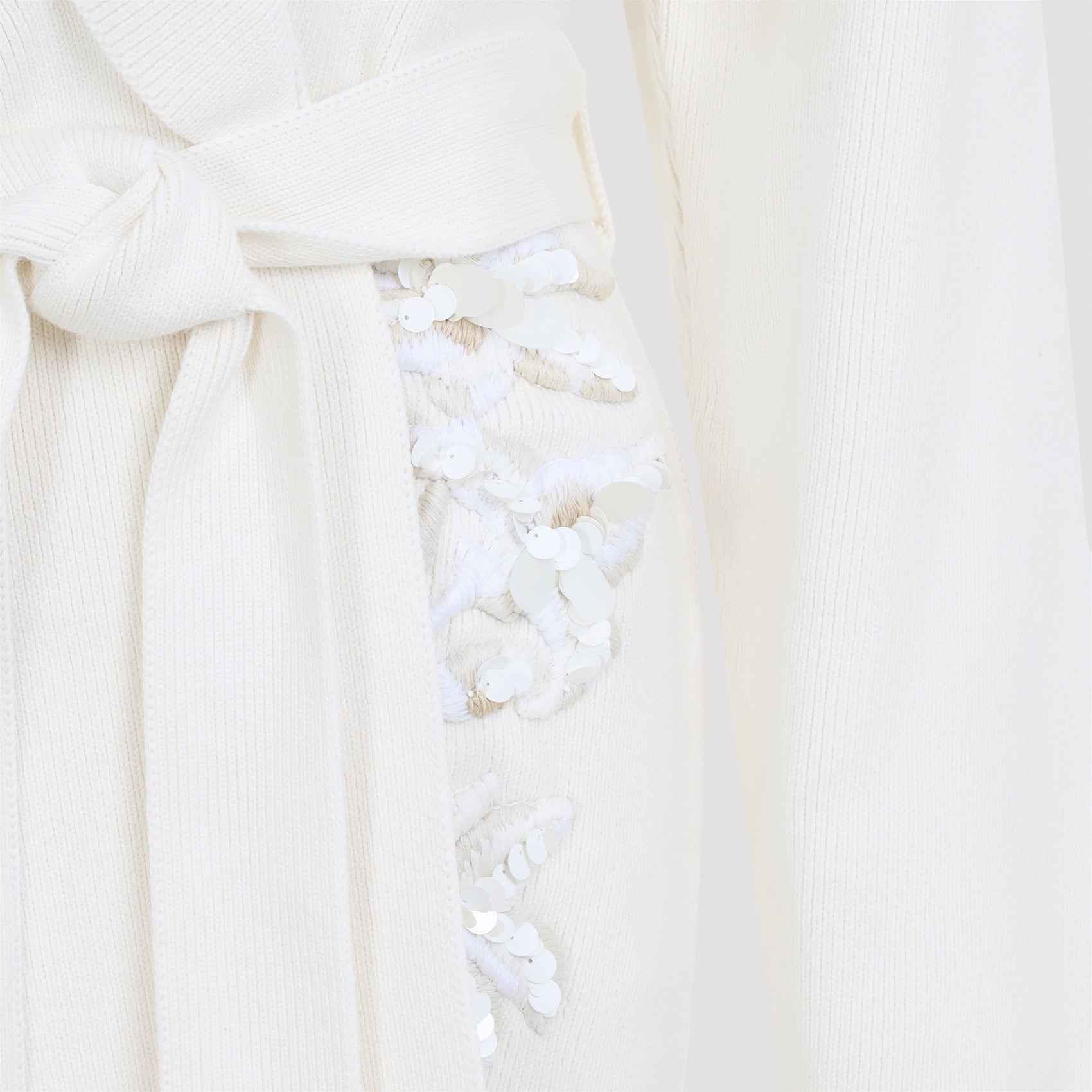 Golden Goose Belted Knit White Cotton Cardigan. Crafted from ribbed white cotton, shawl collar, detachable self-tie belt fastening, dropped shoulders, long sleeves, embroidered flowers adorned with sequins embellishment, side pockets, unlined.