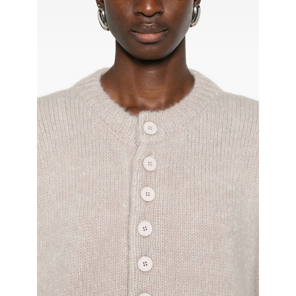 beige round neck front button placket ribbed cuffs and hem long sleeves