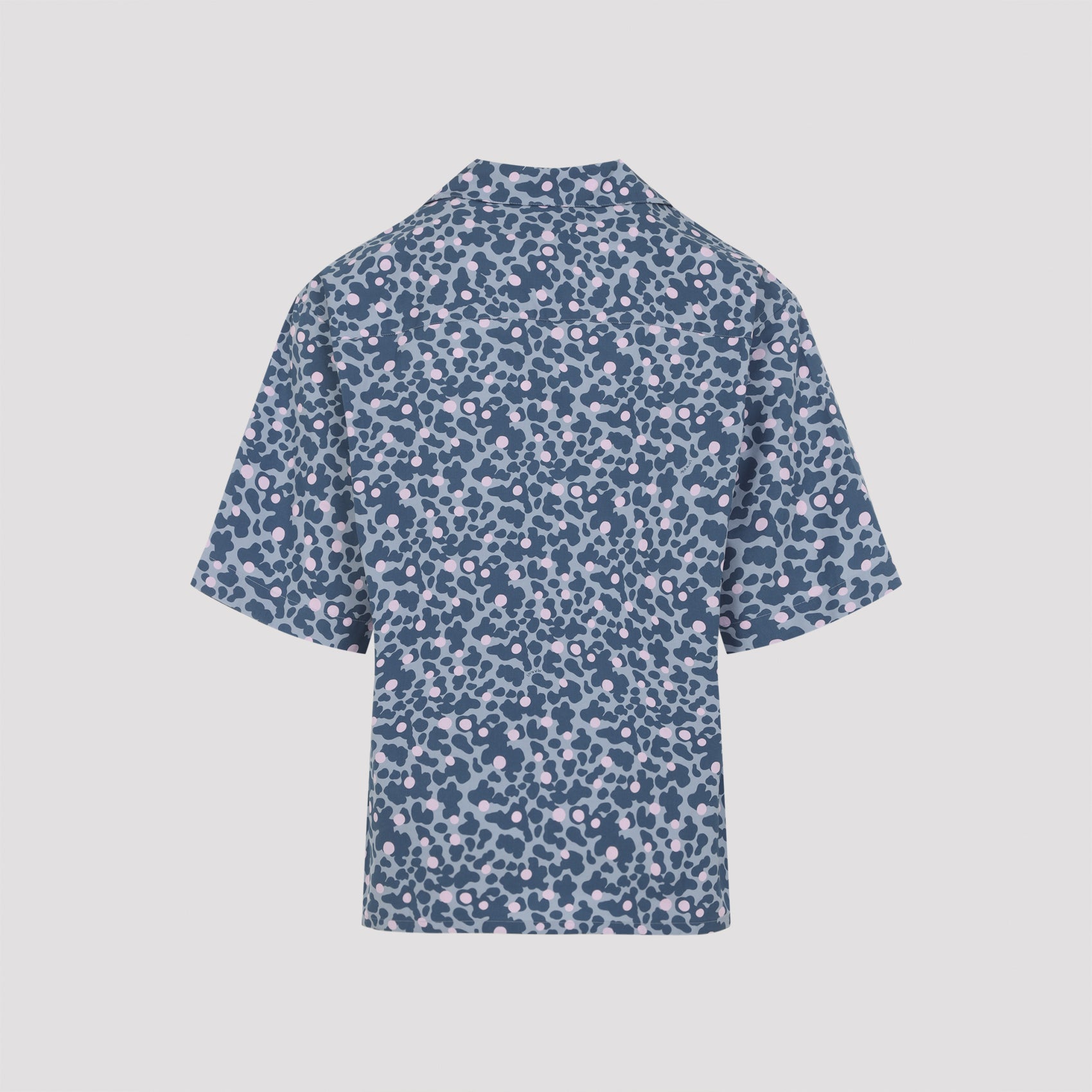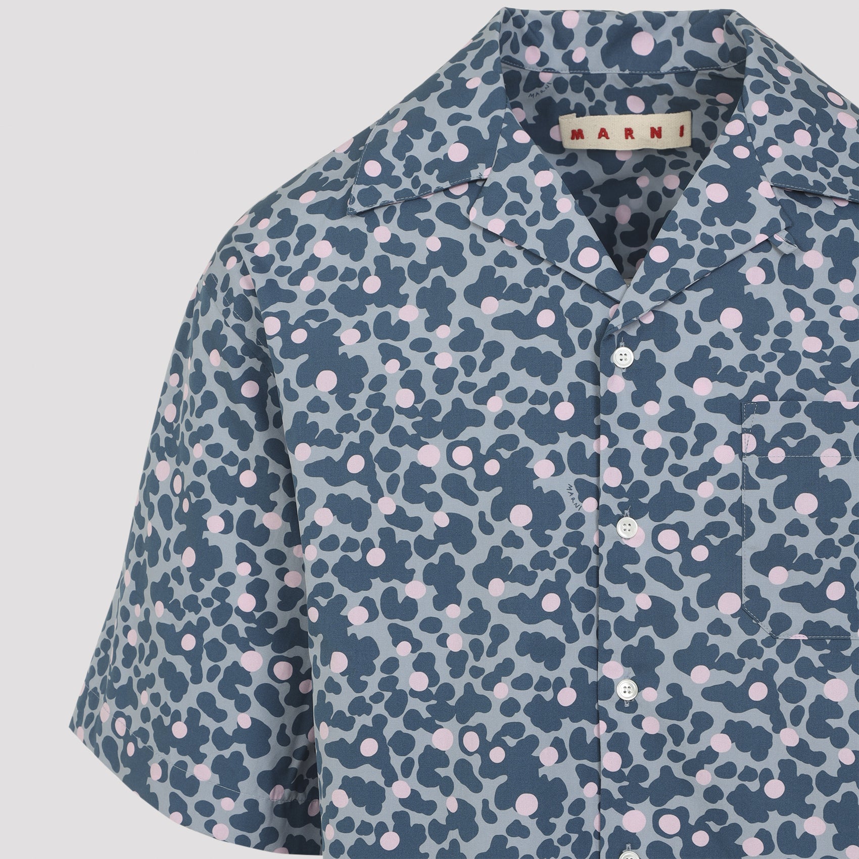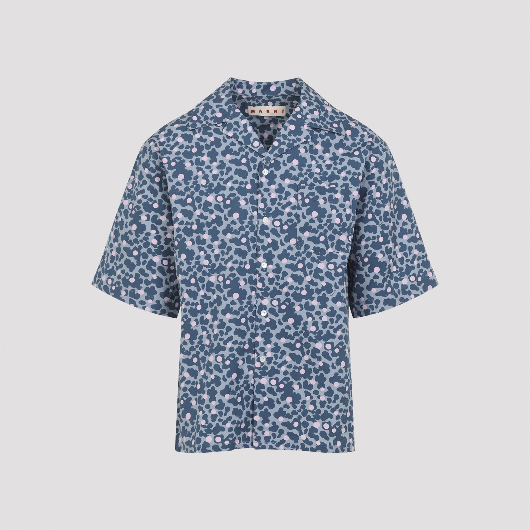 Marni SS Blue Cotton Shirt. Crafted from blue cotton with an all-over seasonal Vibrations print, it features a bowling collar, front button fastening, a patch pocket on the chest, short sleeves, a straight hem, and a boxy fit.