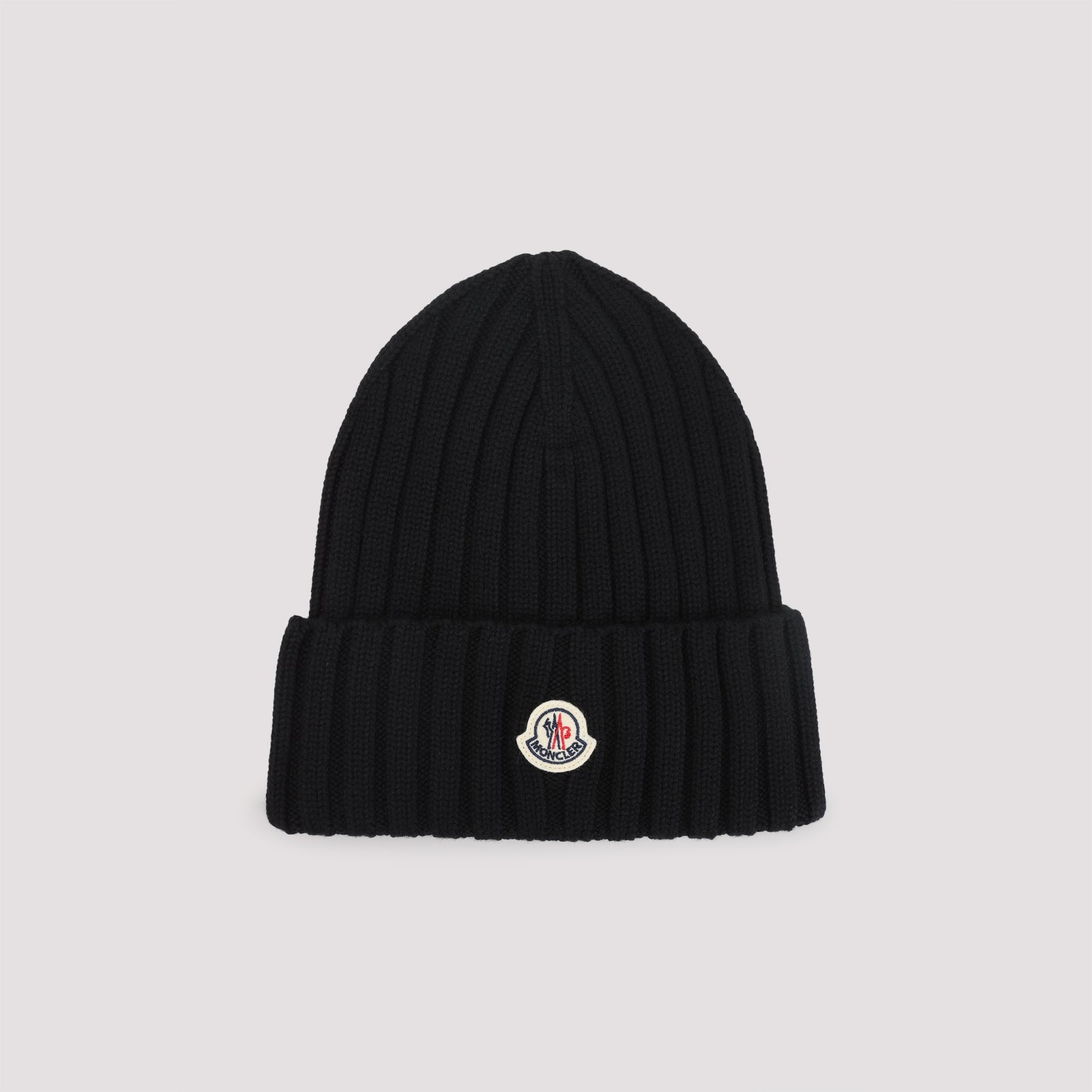 Moncler Black Virgin Wool Hat. Crafted from ribbed black virgin wool, turn-up hem with a logo patch detail.