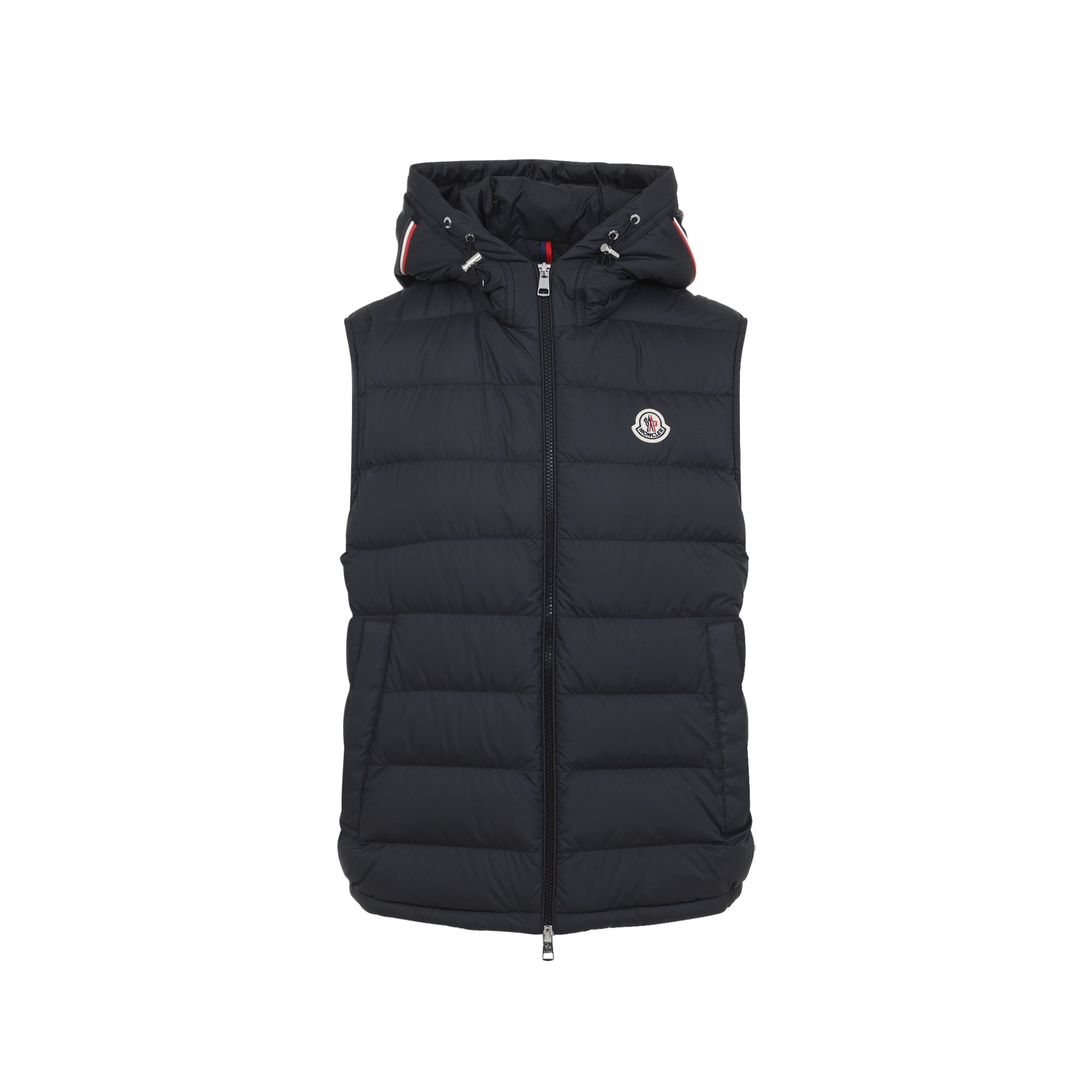 Moncler Black Marseillan Vest. Crafted in polyester fabric. Tonal hood, front tonal drawstring details, front zipped fastening, chest patch logo, side pockets, sleeveless, straight hem, padded design. Blue, white and red stripes on the side of the hood.