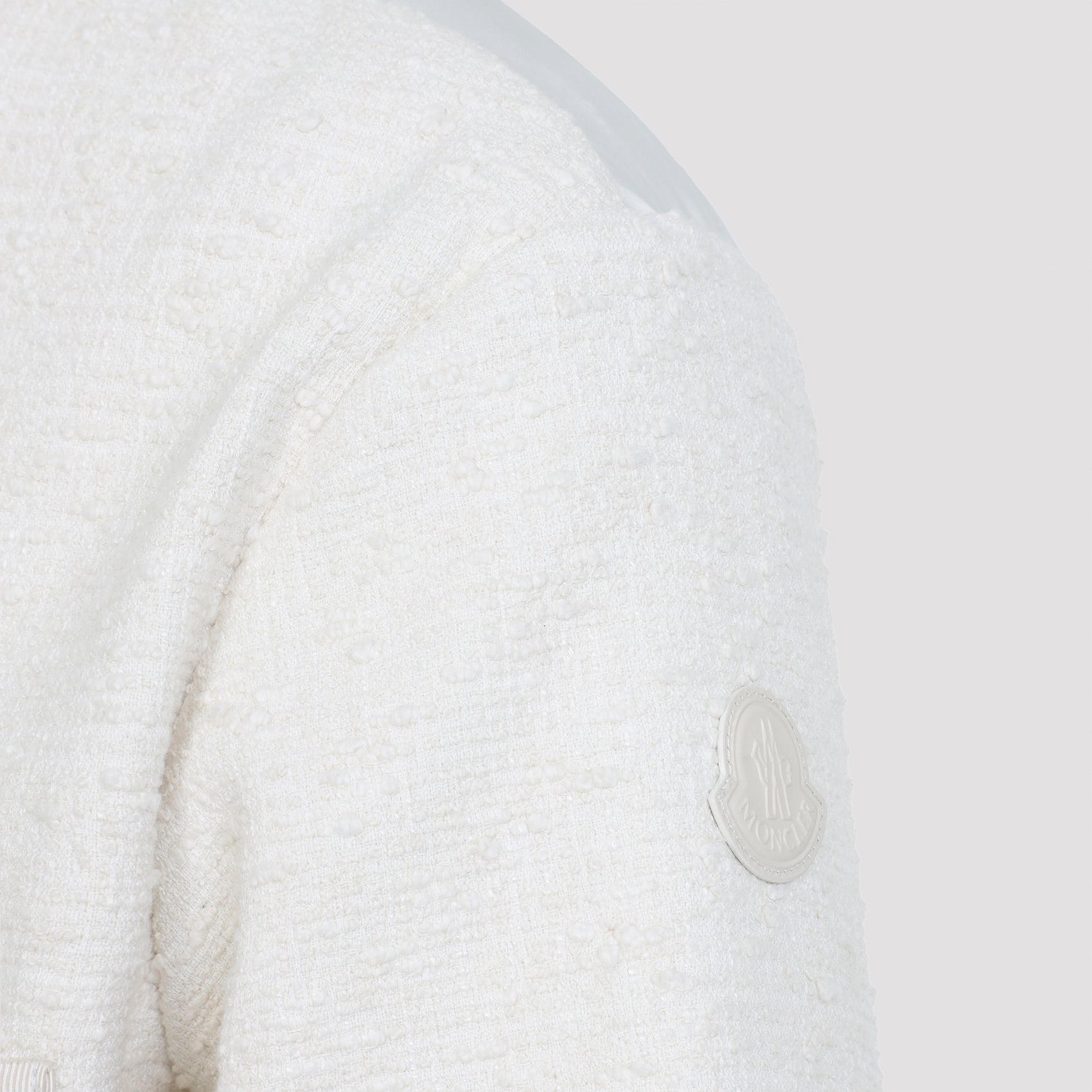 Moncler Camicia Cotone Bianca. Realizzata in misto cotone bouclé, caratterizzata da inserto trapuntato sul retro, colletto a punta, chiusura a due vie con zip, due tasche applicate con bottoni sul petto, due tasche frontali, maniche lunghe, polsini abbottonati con bordo gros-grain, logo applicato sulla manica e fodera completa.