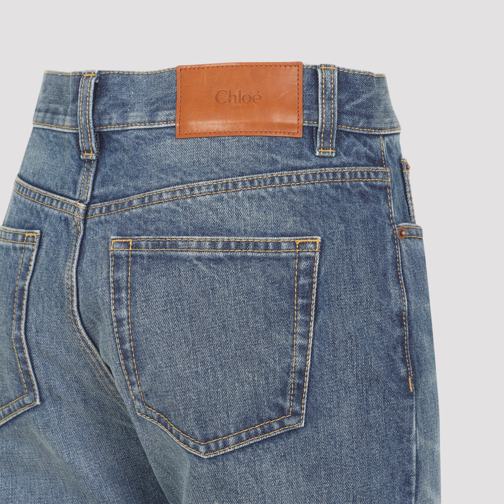 Chloe Blue Cotton Jeans. Crafted from faded blue cotton denim, high waist, 5-pocket construction, belt loops, button and fly-zip fastening, brown leather label with embossed logo at the back waistband, slit at the hem, straight leg.