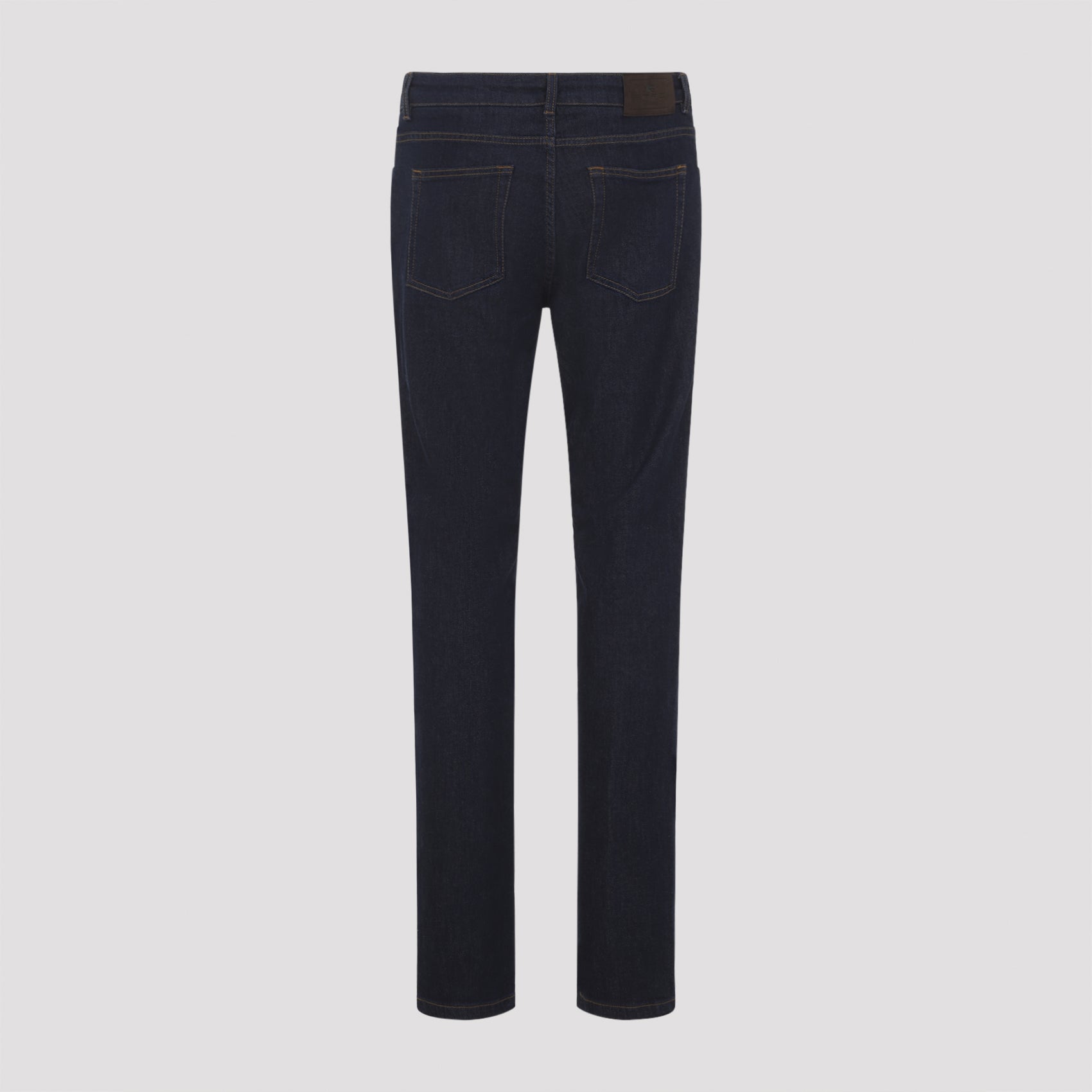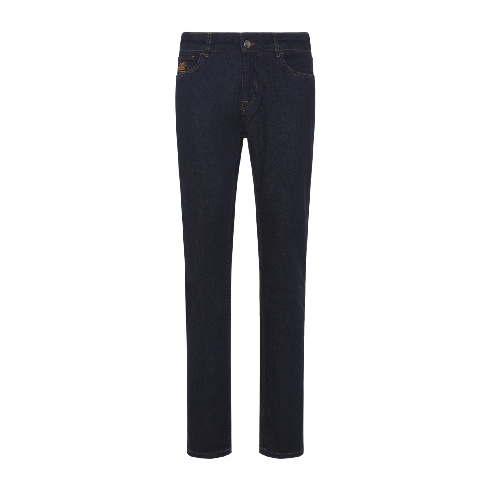Etro Roma Dark Blue Cotton Jeans. Five-pocket jeans crafted from dark blue cotton denim with slight stretch, it features belt loops, front button and zip fly, the Pegaso logo embroidered on the front, a branded leather label at the back of the waist, and a straight leg.