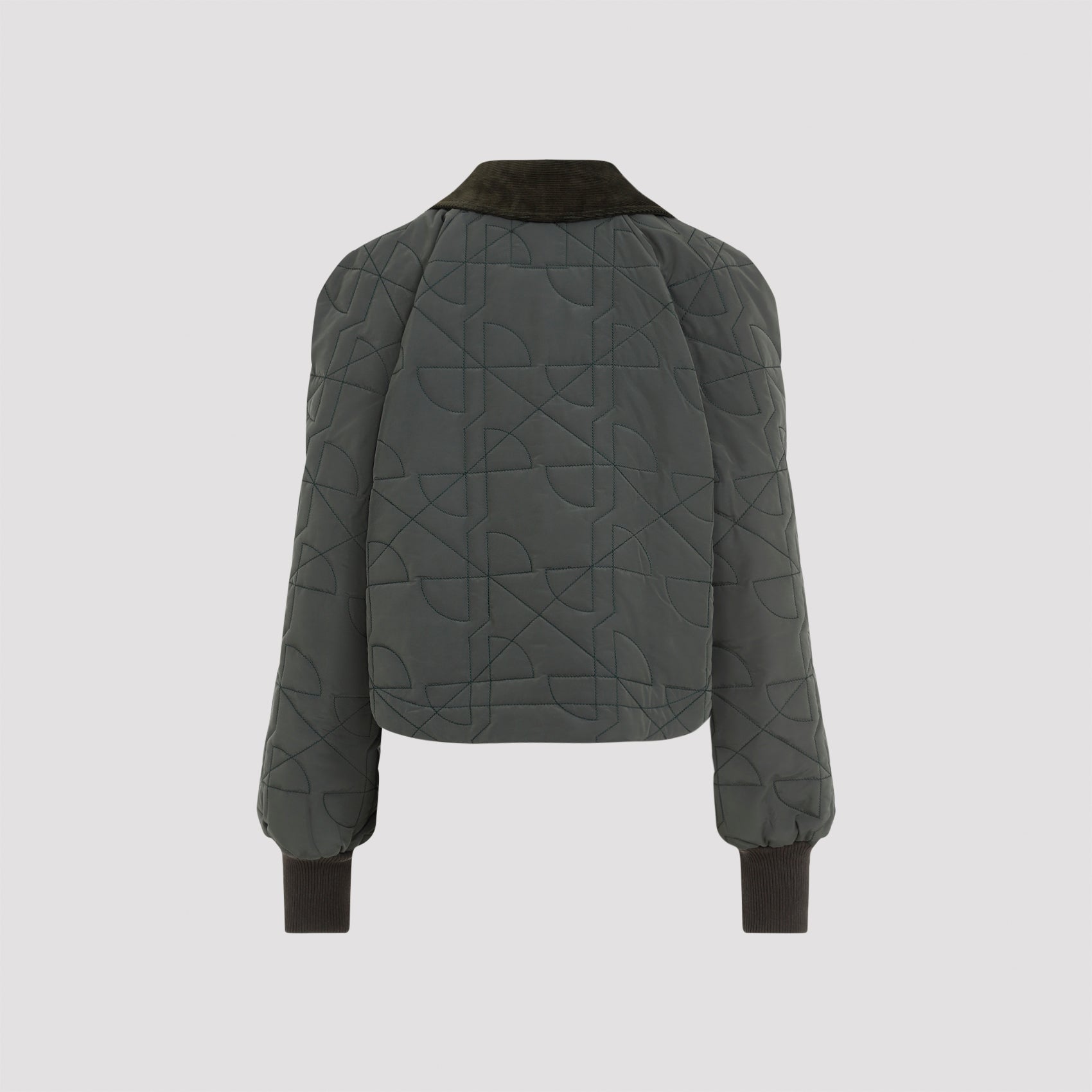 Patou Bottle Green Cropped Quilted Blouson. Crafted in polyamide and polyester blend. Pointed green velvet collar, front buttoned fastening, side flap buttoned fastening, long sleeves, ribbed cuffs, round cropped hem, tonal signature logo stitching.