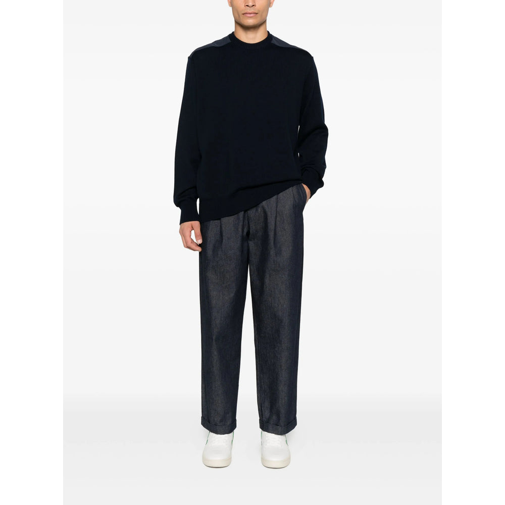 dark blue wool crew neck long sleeves shoulder patches ribbed cuffs