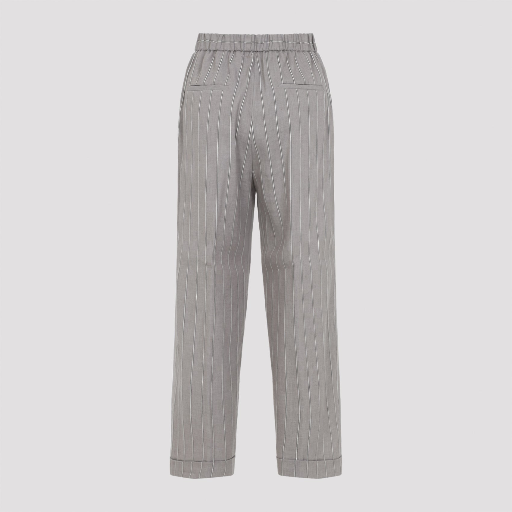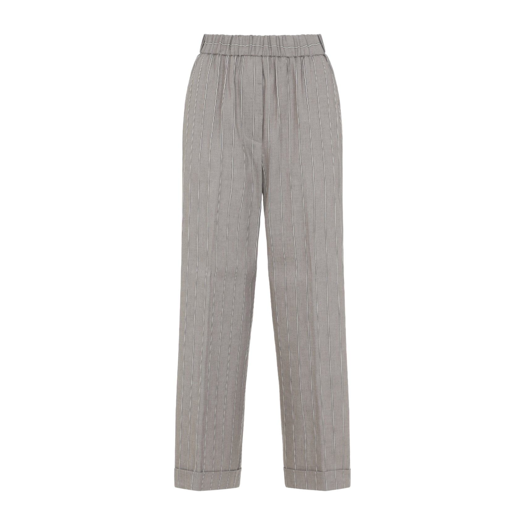 Peserico Brown Linen Pants. Pinstriped pants crafted from a brown linen and cotton blend, featuring an elasticated waistband, slanted pockets, two back flap pockets, straight legs and turn‑up hems.