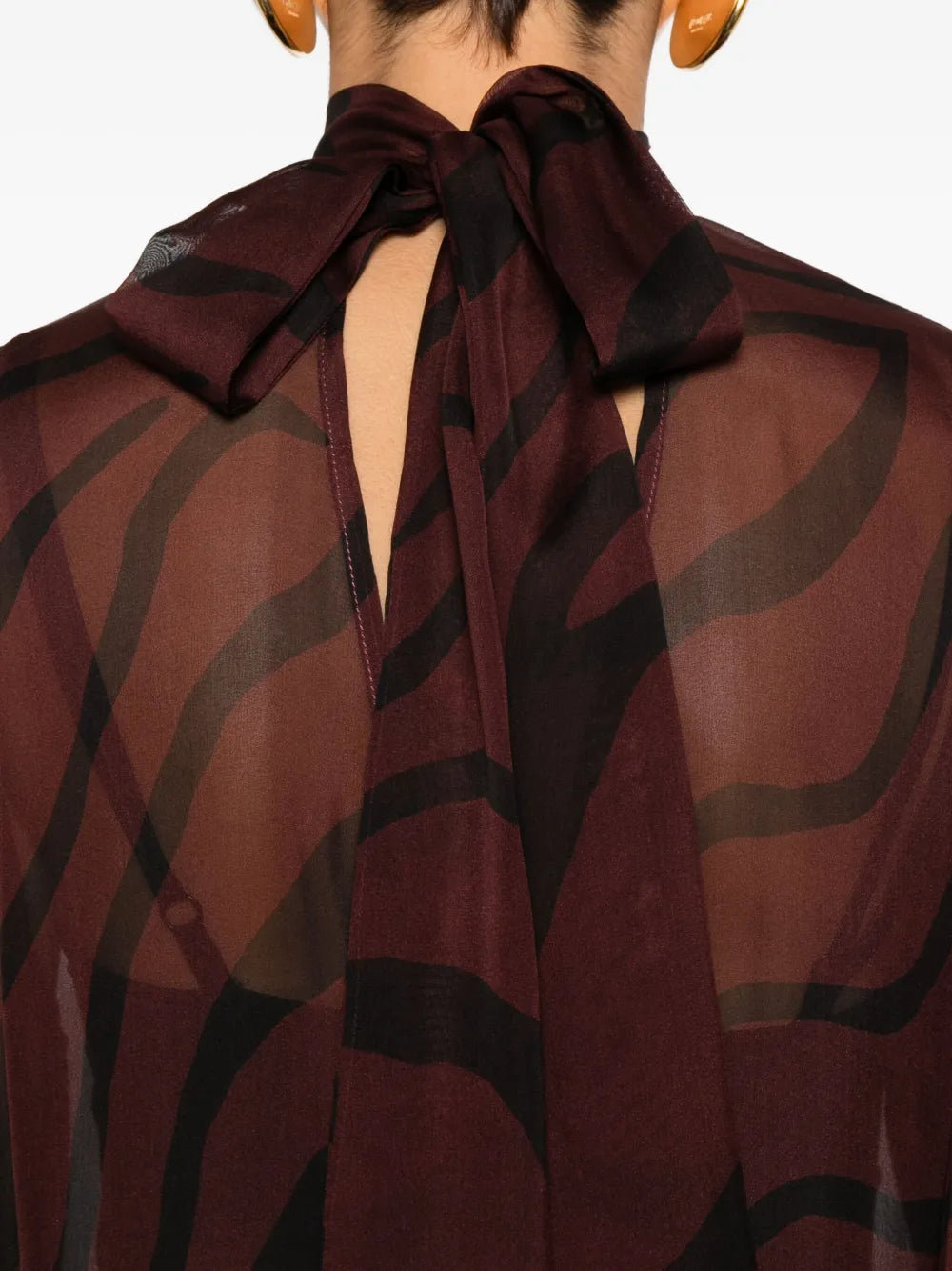 abito con stampa zebrata stampa zebrata rosso bordeaux, collo alto, maniche lunghe, dettaglio a buco della serratura sul retro, chiusura posteriore con lacci Origine: Italia Composizione tessuto 100% Istruzioni per il lavaggio Leggi le indicazioni del produttore ID 5L03059