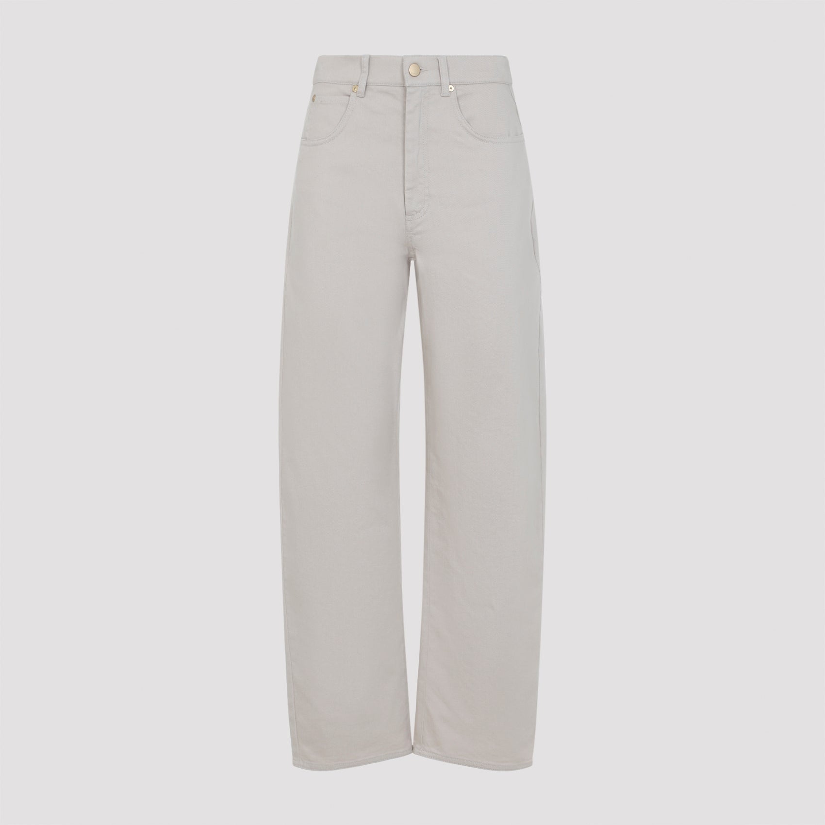 Max Mara`s Emily White Cotton Pants. 5-pocket pants crafted from white stretch cotton bull denim, featuring a mid-waist, belt loops, front button and fly-zip fastening, gold-toned metal rivets, and a barrel leg.