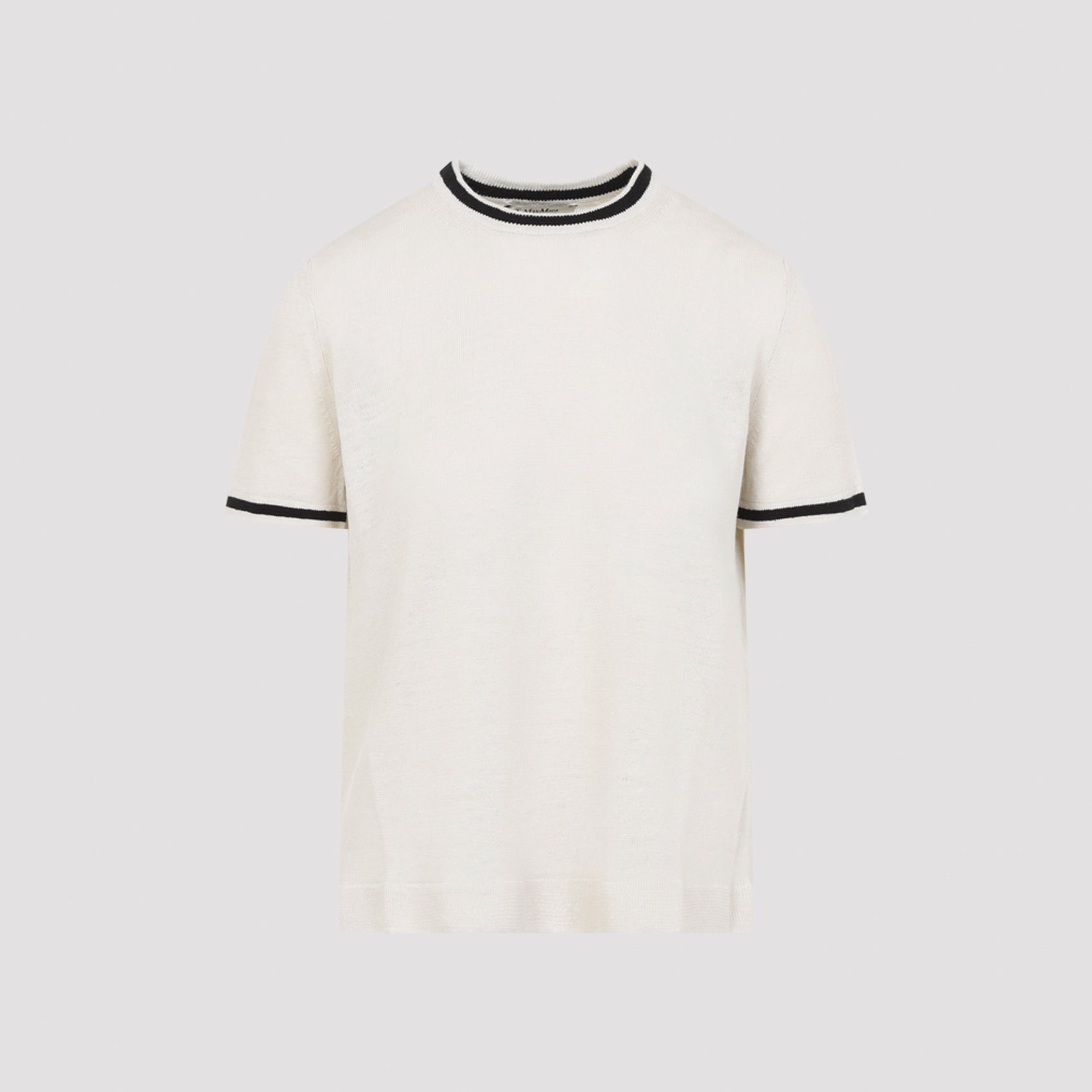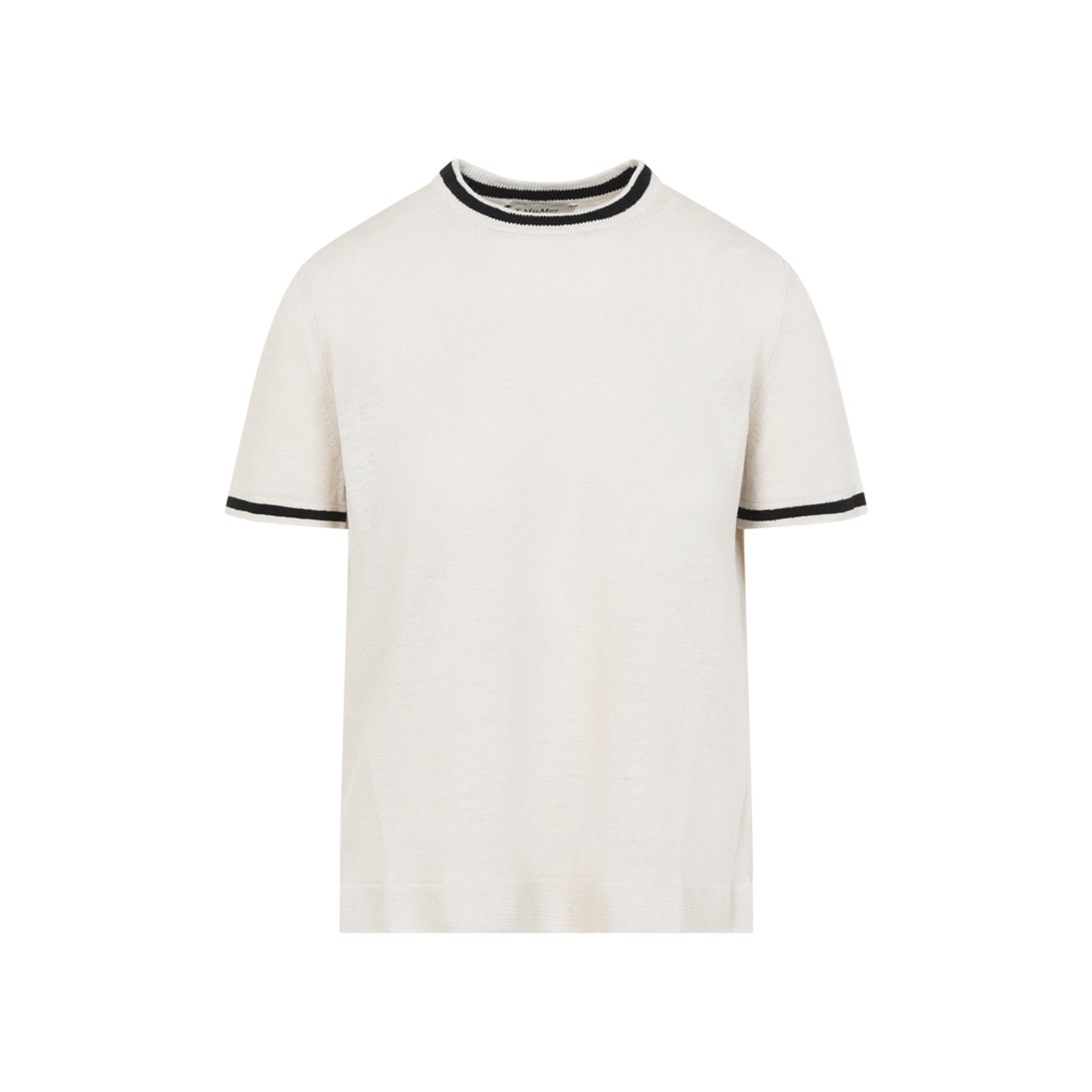 Max Mara`s Natural White Linen Nordica Striped Knit T-Shirt. Pure natural white linen t-shirt, round neck, short sleeves, straight hem, knitted design, contrasting black stripe details on the neck and on the edges.