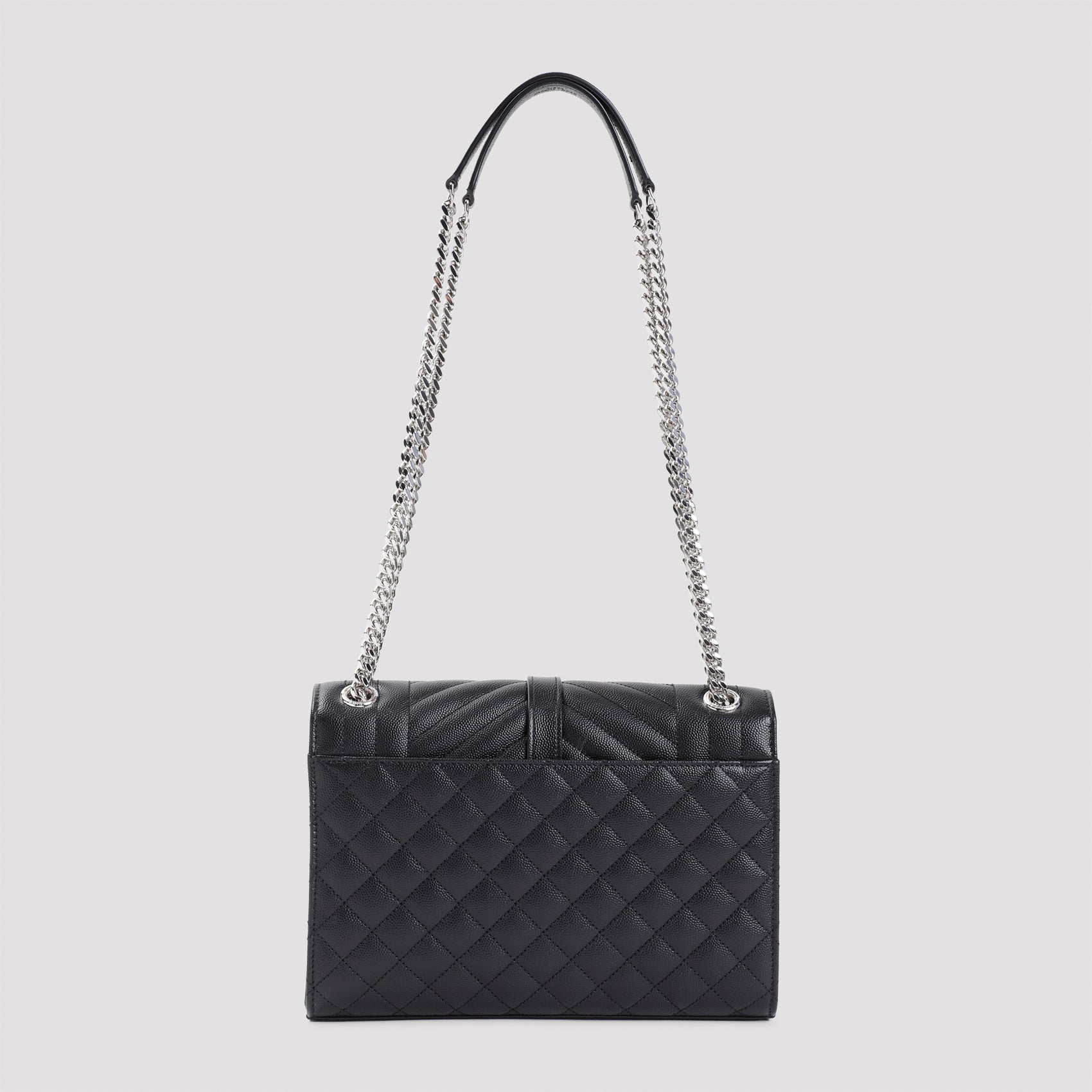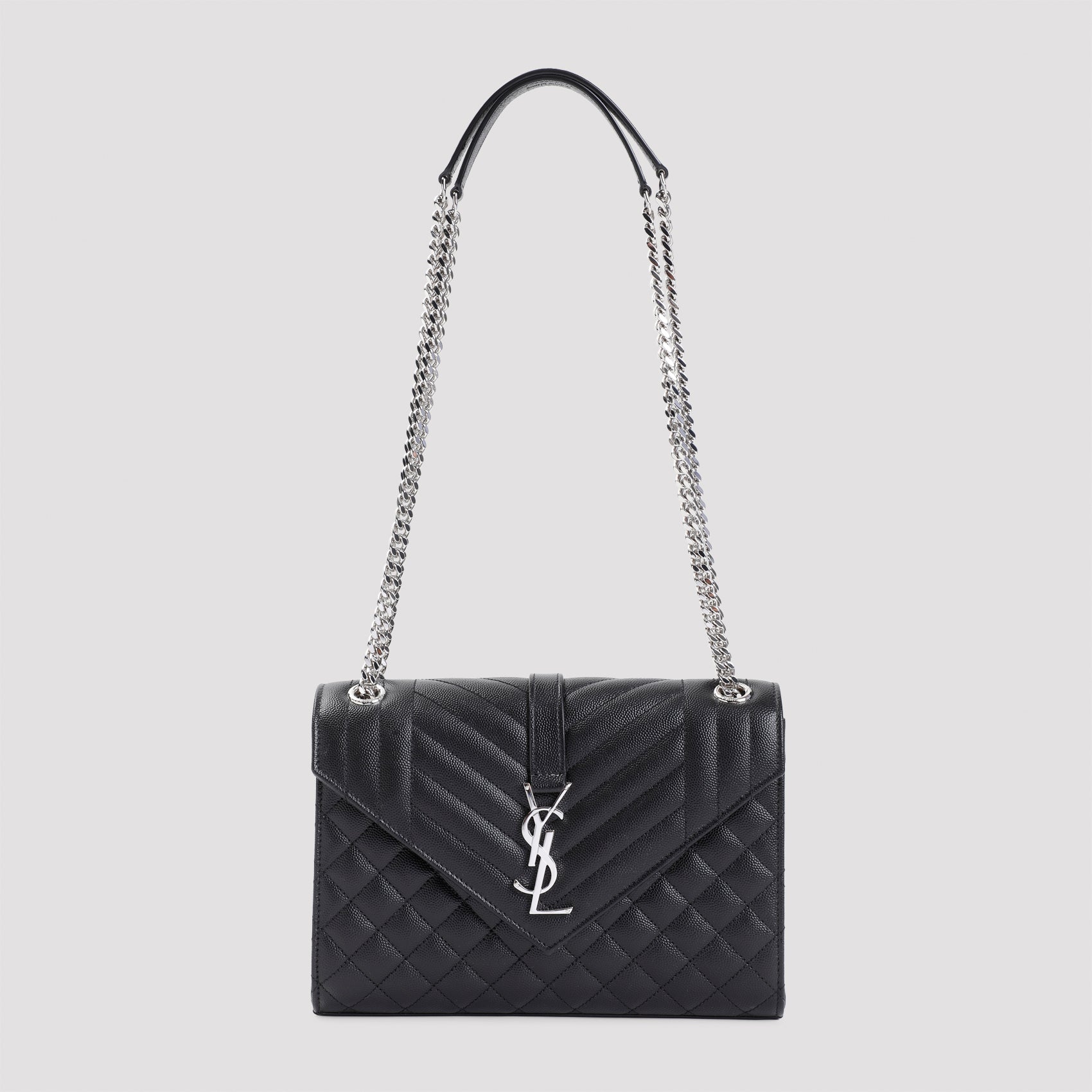 Saint Laurent Black Grained Leather YSL Envel Bag. Pure black grained leather bag, top shoulder straps with chain details, front flap fastening, front metallic signature YSL detail, inner pocket, inner patch logo, one main compartment. Silver-tone hardware. Quilted effect.