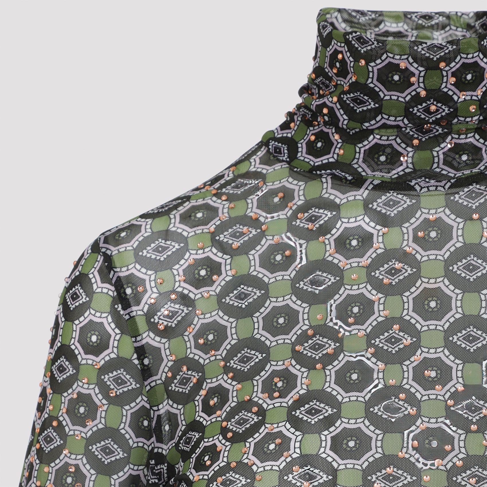 Dries Van Noten Hoyser Green Polyamide Sweater. Crafted from green mesh, turtleneck, geometric graphic print all over, long sleeves, straight hem, slim fit.