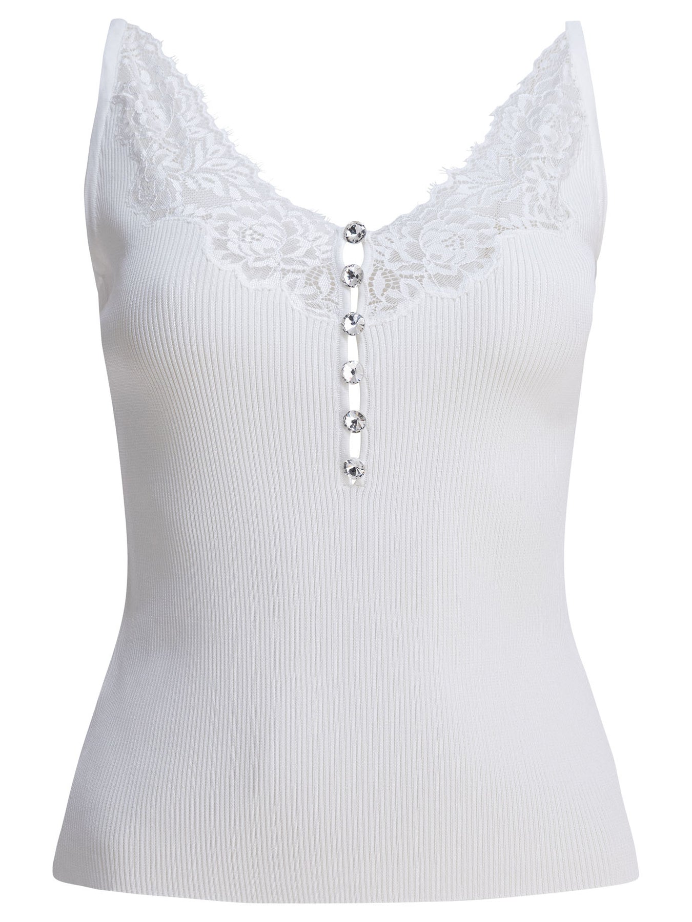 Ribbed Tank Top With Lace Neckline Top Bianco