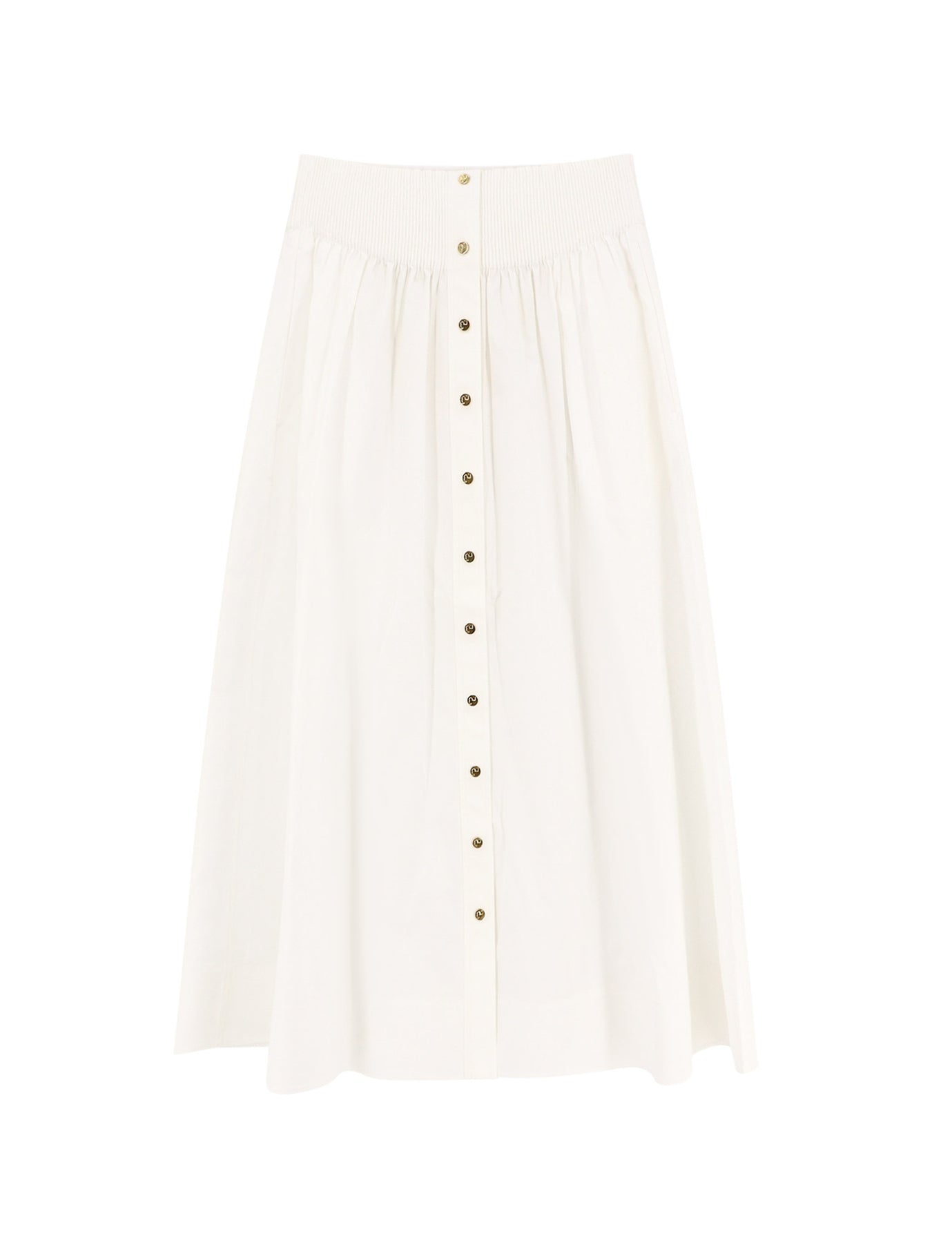 Ribbed elastic waistband Closure with gold metal snap buttons Lateral welt pockets Flared and unlined 96% cotton 4% elastane SKU: 161691100