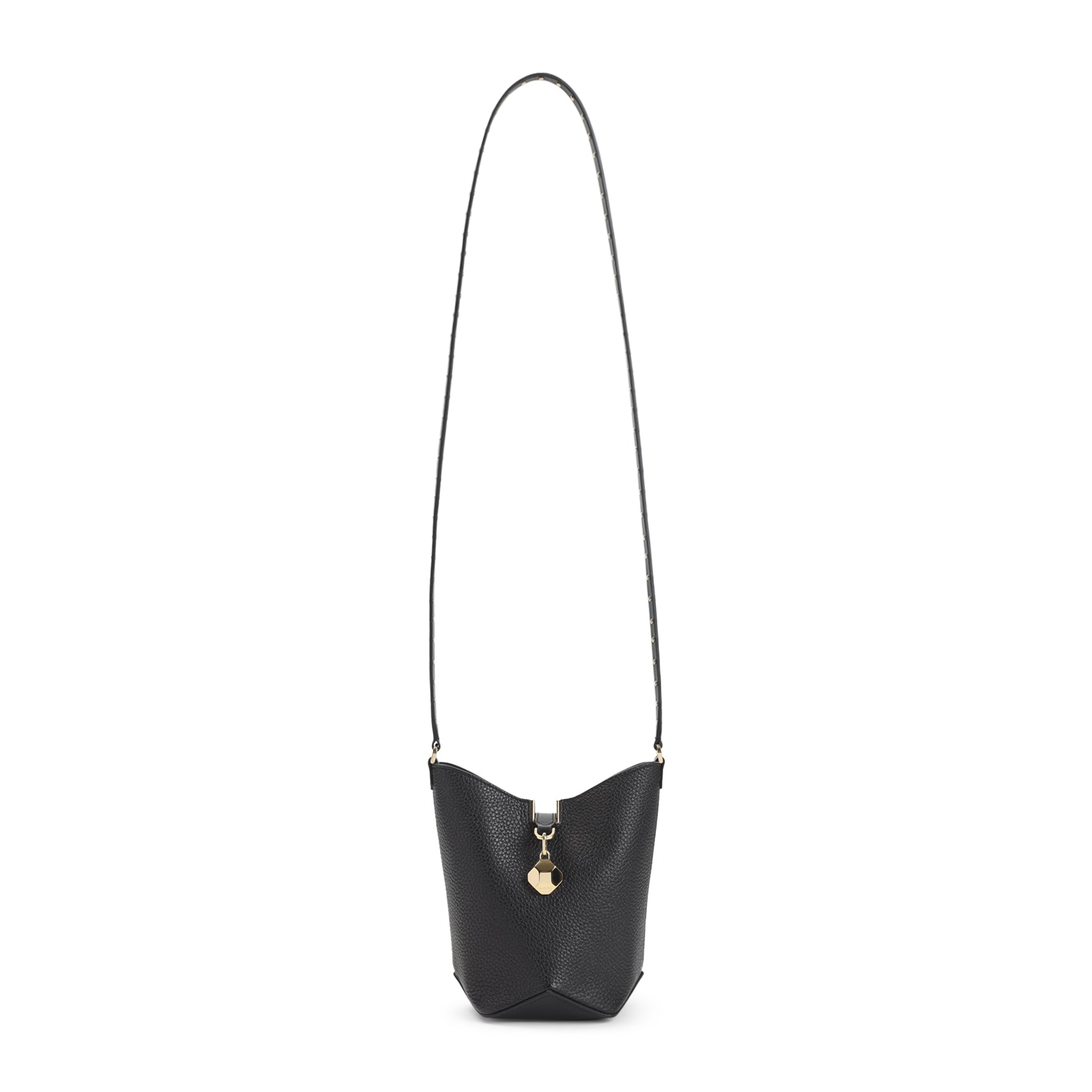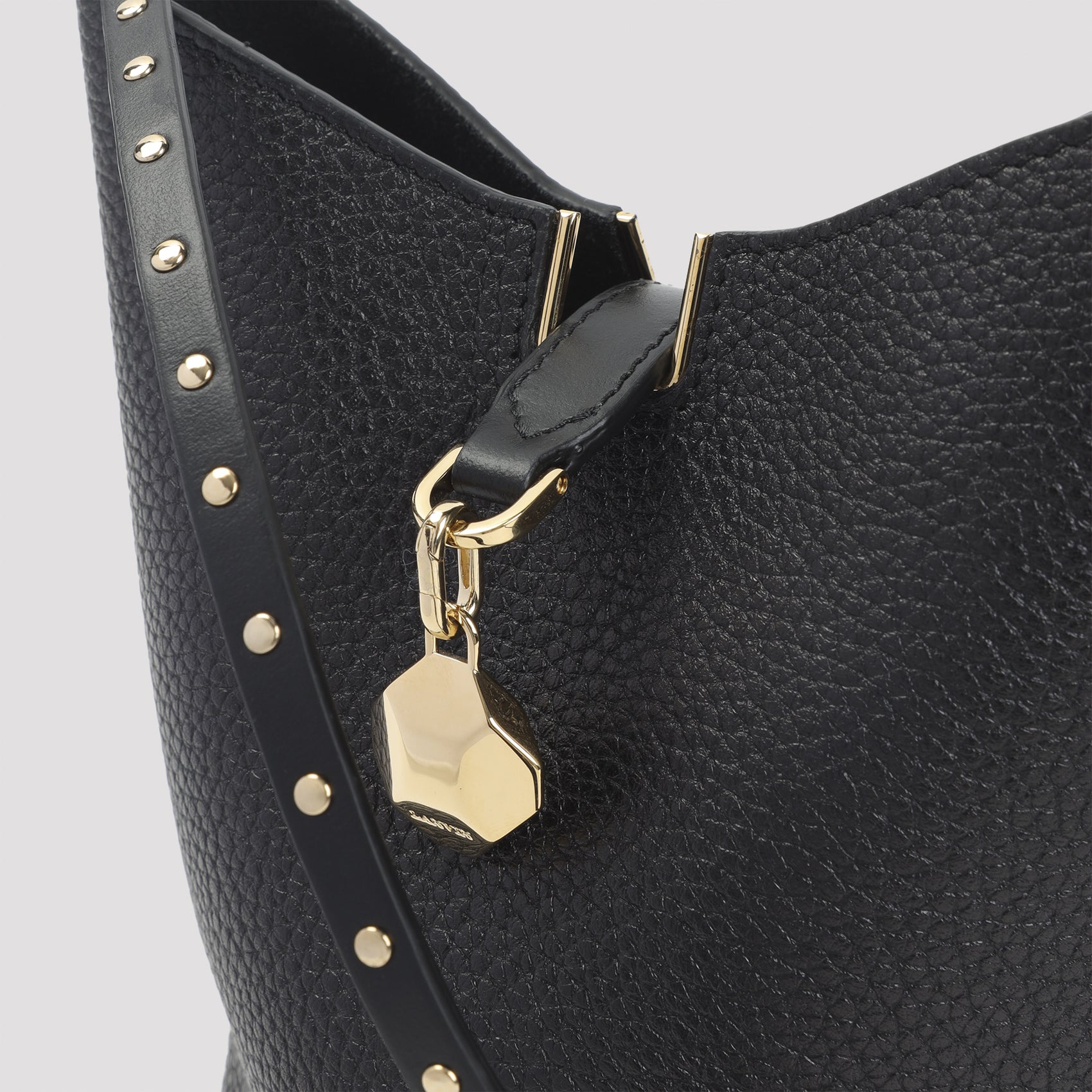 Lanvin Strap Pm Black Calf Leather Handbag. Crafted from grained black calf leather, it features gold-toned hardware, a metal jewel clasp with logo fastening, a shoulder strap with studs throughout, a logo stamp on the side, and an inner detachable mirror.