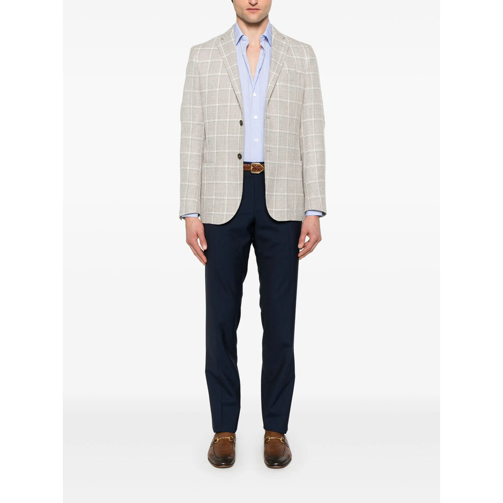 navy blue concealed front button, hook and zip fastening two side slash pockets two rear button-fastening pockets belt loops