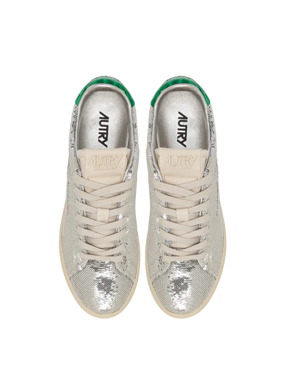 SNEAKERS DALLAS LOW `SPARKLING` IN PAILLETTES ARGENTO E VERDE Autry presenta Bloom, Le silhouette delle sneakers più iconiche vengono reinterpretate con dettagli sofisticati e texture inaspettate: dal velluto alla pelle laminata, dal nubuck al suede. Ogni modello rivela una personalità distintiva, resa unica da ricami floreali romantici, scintillii di paillettes e cristalli glam, micro-borchie grafiche o fiocchi oversize. Ogni sneakers diventa una dichiarazione di stile, un modo autentico e libero di raccontarsi. CARATTERISTICHE: Tomaia in paillettes. Lacci piatti in cotone. Logo jacquard. Label con ricamo cucita sulla linguetta. Colletto imbottito. Fodera in pelle e spugna di cotone. Soletta in pelle rialzata di 2 cm. Suola in gomma. Altezza suola: 2,5-3,5 cm. Pochette personalizzata in tessuto. COMPOSIZIONE: Tomaia: 80% poliestere, 15% nylon, 5% pelle Fodera: 40% pelle, 50% spugna di cotone, 10% nylon ID ADLWTI01