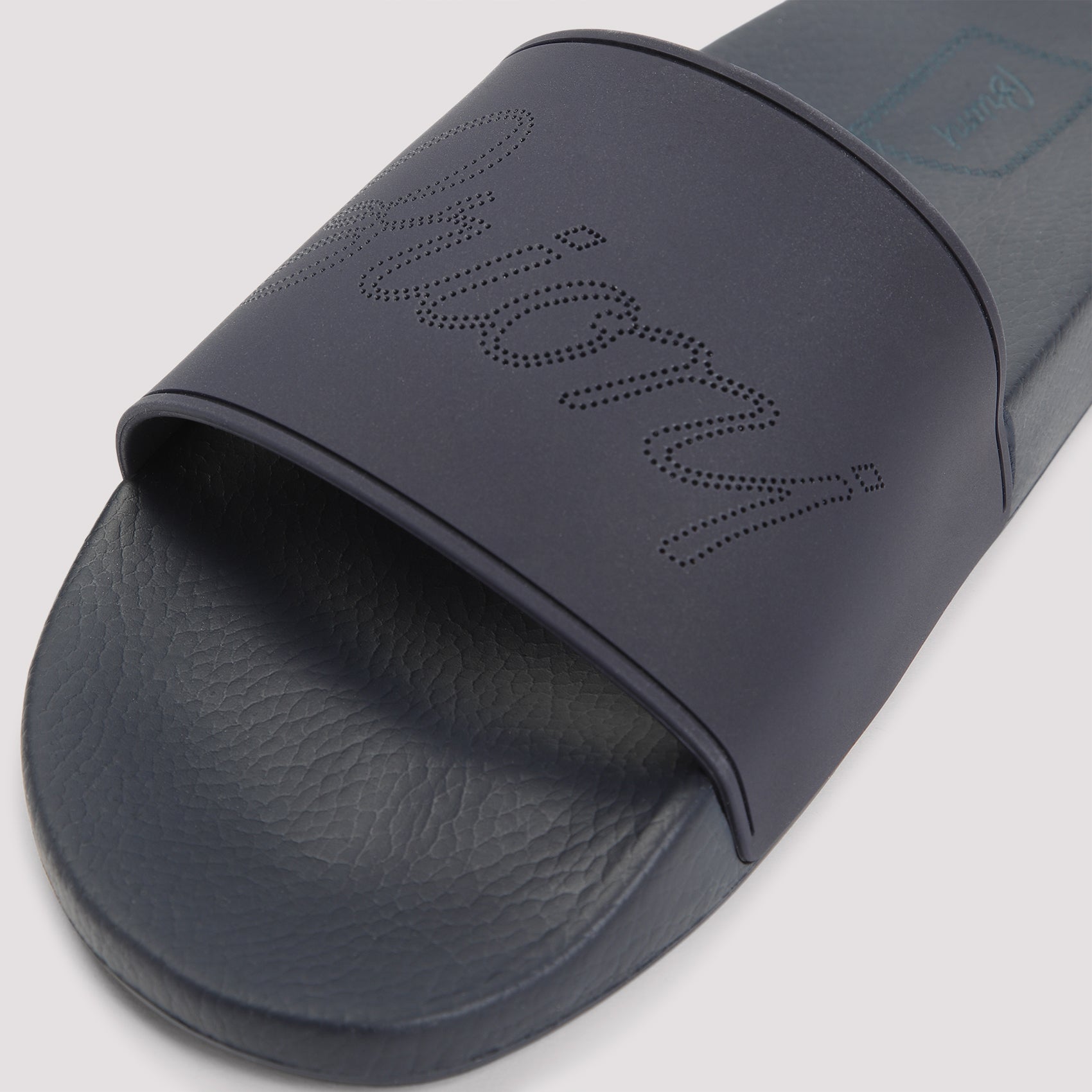 Brioni Pool Navy Blue Elastodiene Sandals. Navy blue tech fabric, front strap with perforated logo, round open toe, tonal branded insole and outsole.
