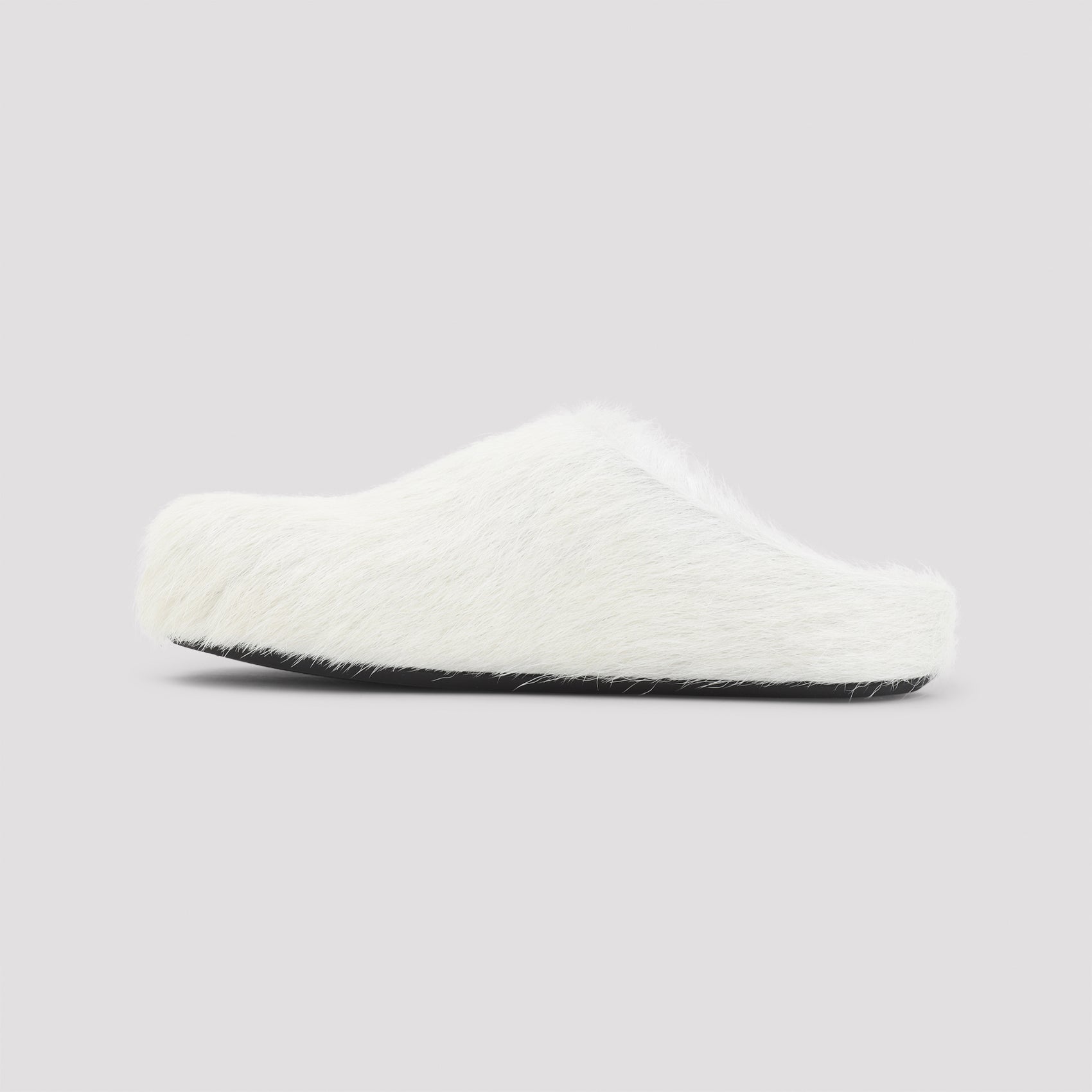 Marni Natural white Calf Hair Fussbett Mules. Fluffy leather upper, round toeline, logoed leather insole and rubber sole, slip-on style.