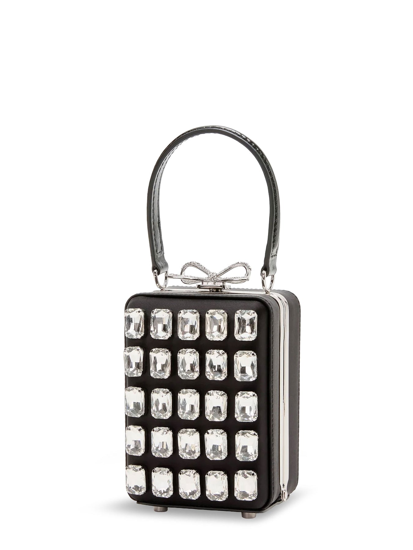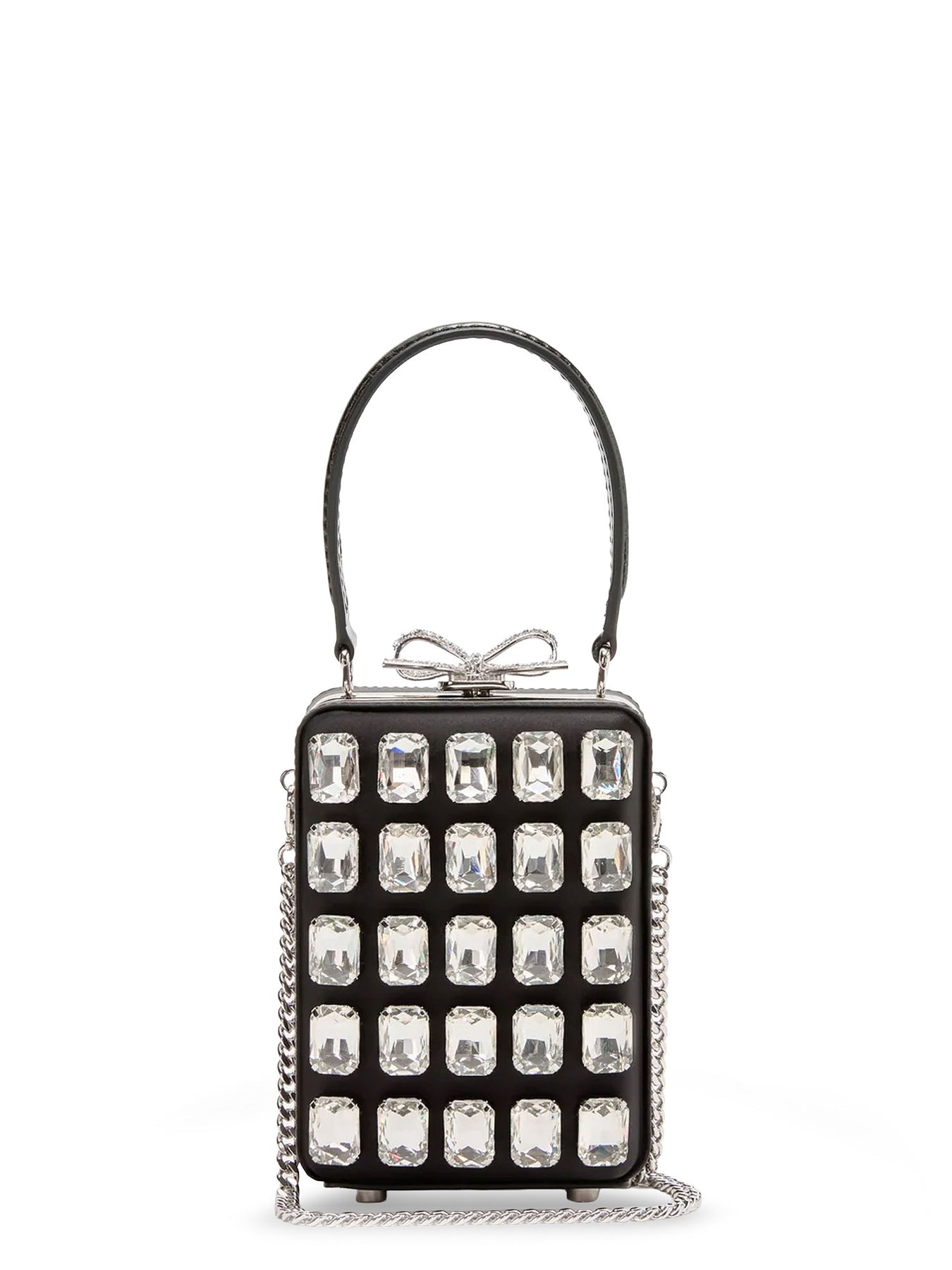 Leather handle Hook closure Crystal bow detail Removable metal shoulder strap One internal pocket Satin/Crystal W: 11 cm, H: 13 cm, D: 6 cm SKU: RS26302DBBLACK