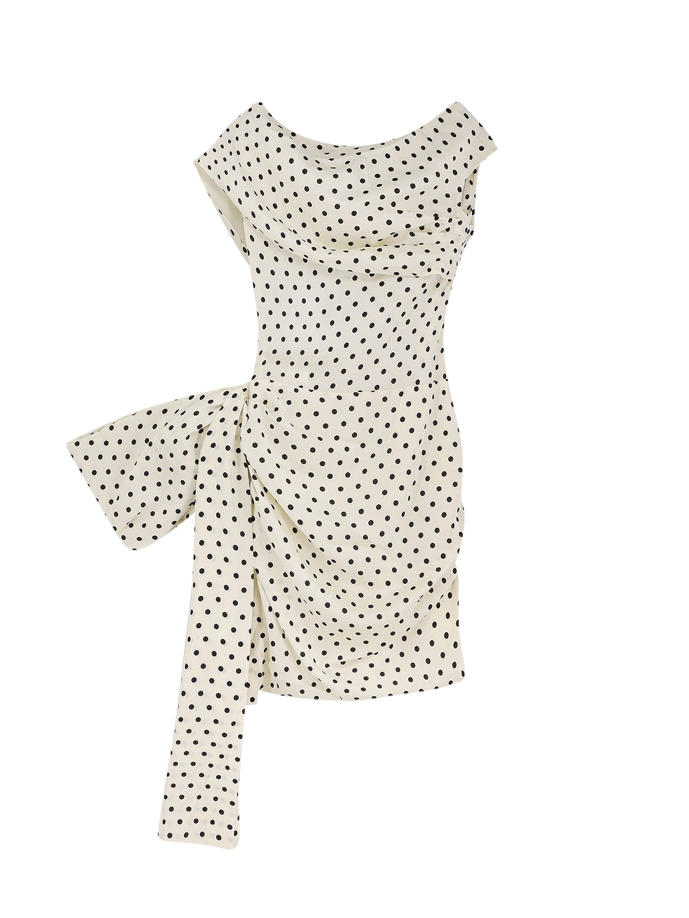 Side zip closure Sleeveless Bow detail with train Polka dot pattern 95% polyester 5% elastane Lining: 100% polyester SKU: RS26002SCCREAM