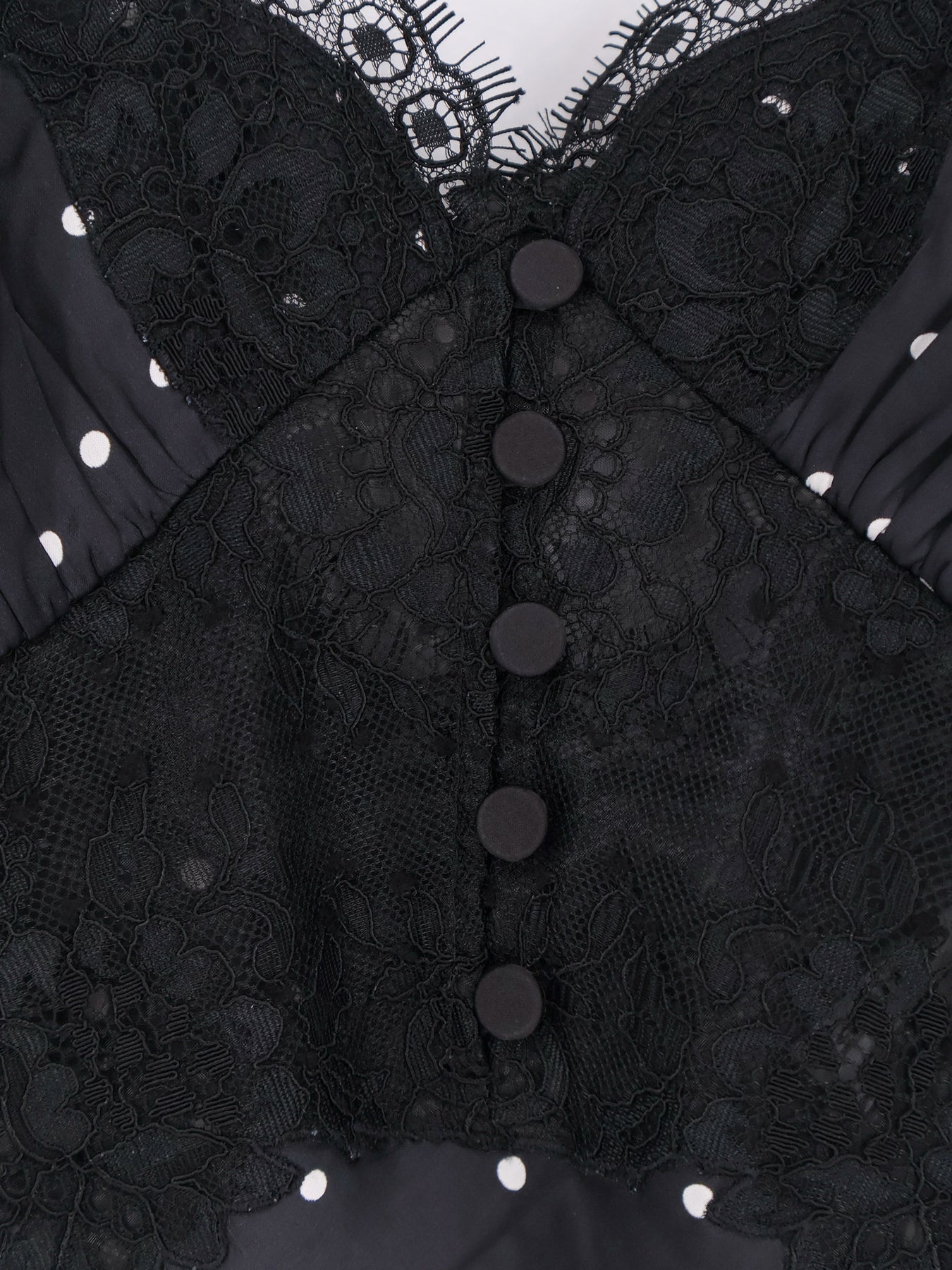 Covered button closure Lace trim Rounded neckline Unlined Polka dot pattern 97% polyester, 3% elastane SKU: RS26176XABBLACK AND WHITE