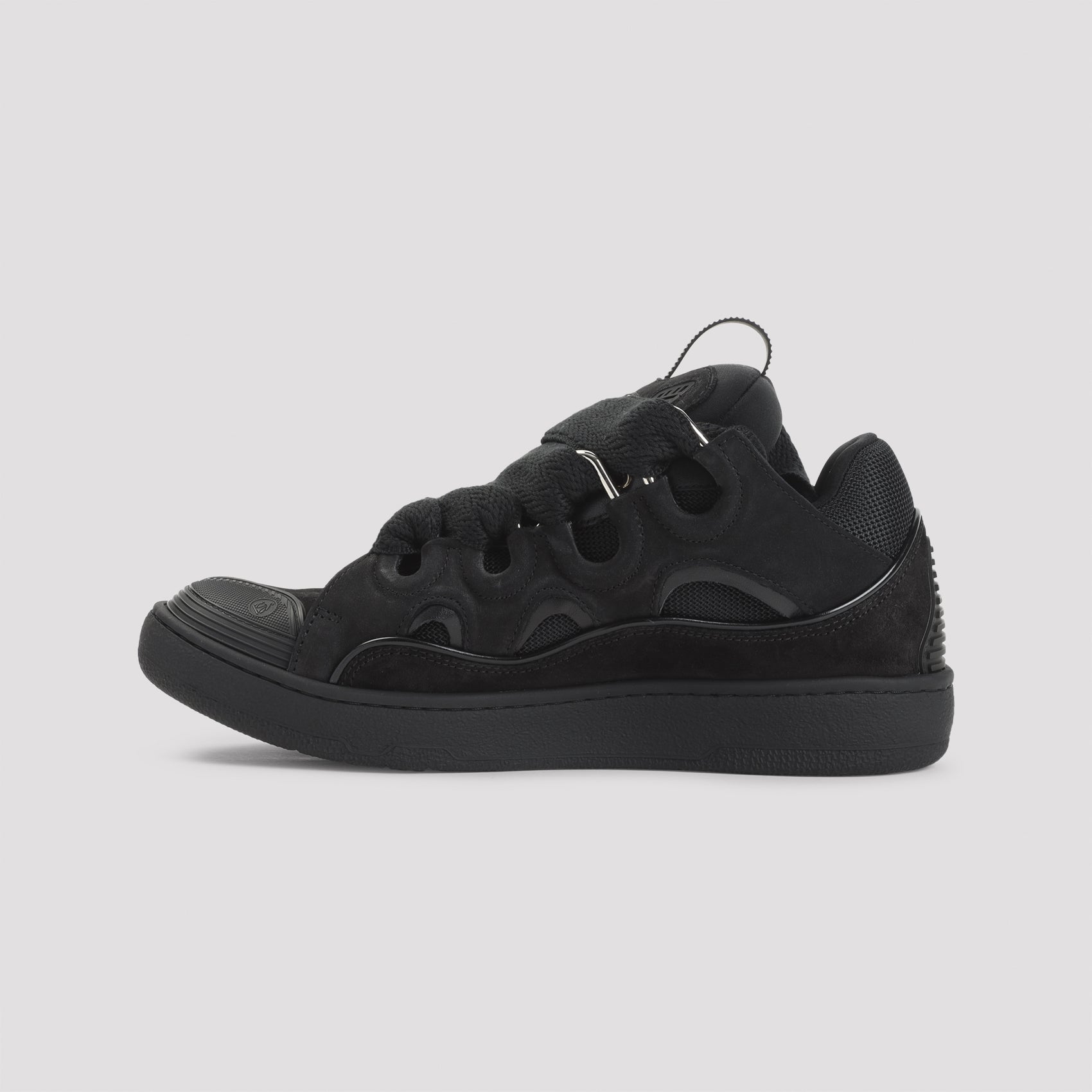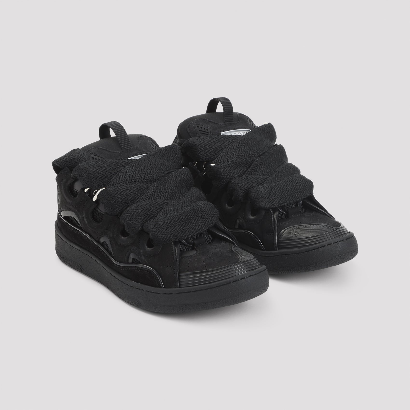 Lanvin Curb Black Calf Leather Sneakers. 90s-inspired sneakers, the multi-layer vamp is crafted from black calf leather and mesh with tonal suede leather and rubber inserts. They feature an almond toe, a woven double lace fastening, a padded tongue with branded plaque, branded textile lining and insole, and a black rubber outsole.
