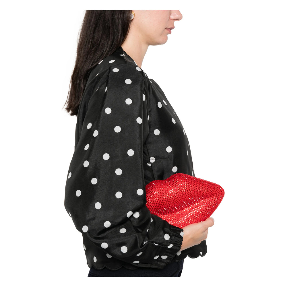 black polka dot pattern scalloped hem round neck long sleeves concealed front button fastening