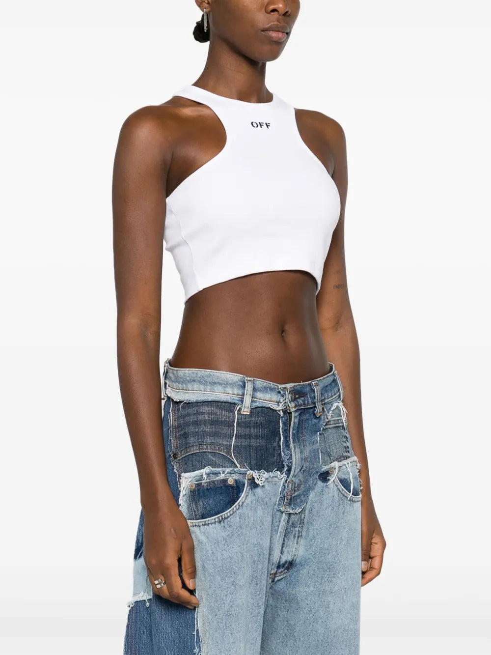Top corto Off-Stamp Bianco, design a coste, stampa con logo sul davanti, senza maniche, scollo olimpionico, orlo dritto e design crop. Origine: Italia Composizione cotone 98%, elastam 2% Istruzioni per il lavaggio Lavare in lavatrice ID OWAD086C99JER0020110