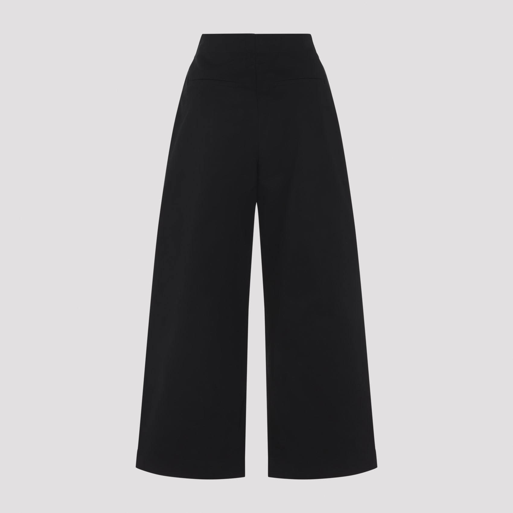 Studio Nicholson Dordoni Volume Black Cotton Pants. High-waisted pants crafted from black cotton, featuring a low crotch, two front darts, front concealed fastening, two side pockets, two welt pockets at the back, and gently curved leg silhouettes.